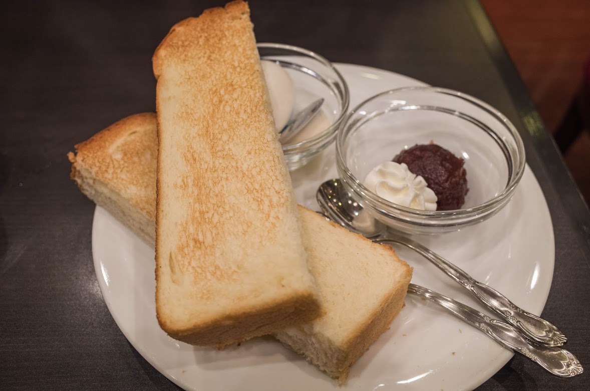 Start your day early with a thick slice of Ogura (小倉) toast, a Nagoya specialty featuring a thick slice of buttered toast topped with red bean paste.