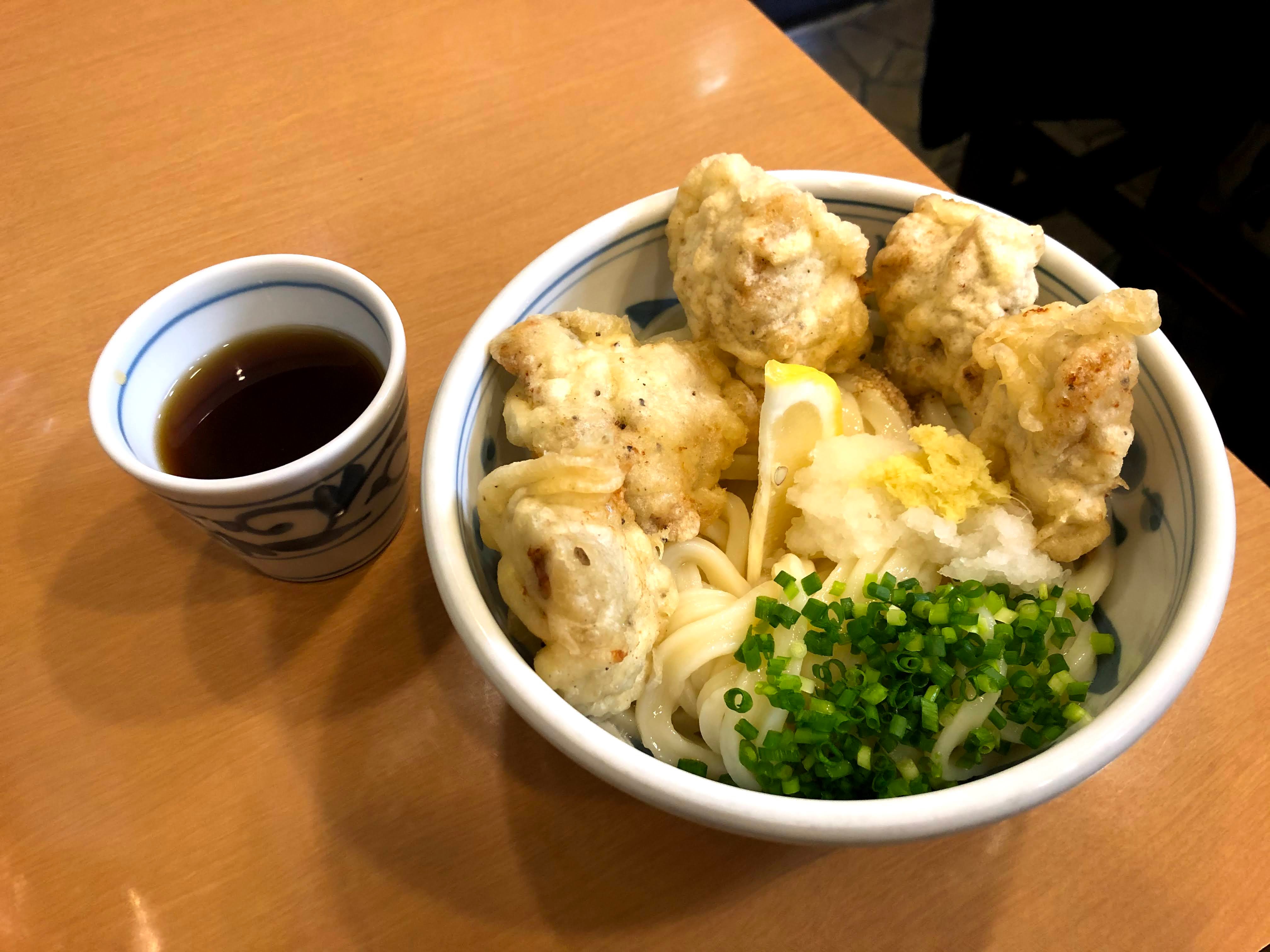 After a morning of hard labour churning out udon, give an expert’s udon a try at Fugetsu (風月). Their most popular dish is the Kashiwa Ten Oroshi Udon (かしわ天おろしうどん) for ¥750, a hearty and simple dish with cold, chewy udon, topped with kashiwa tempura (かしわ天ぷら Japanese brown rooster meat tempura) in a crispy light batter. Be sure to head there early, because a long line forms during lunch time.