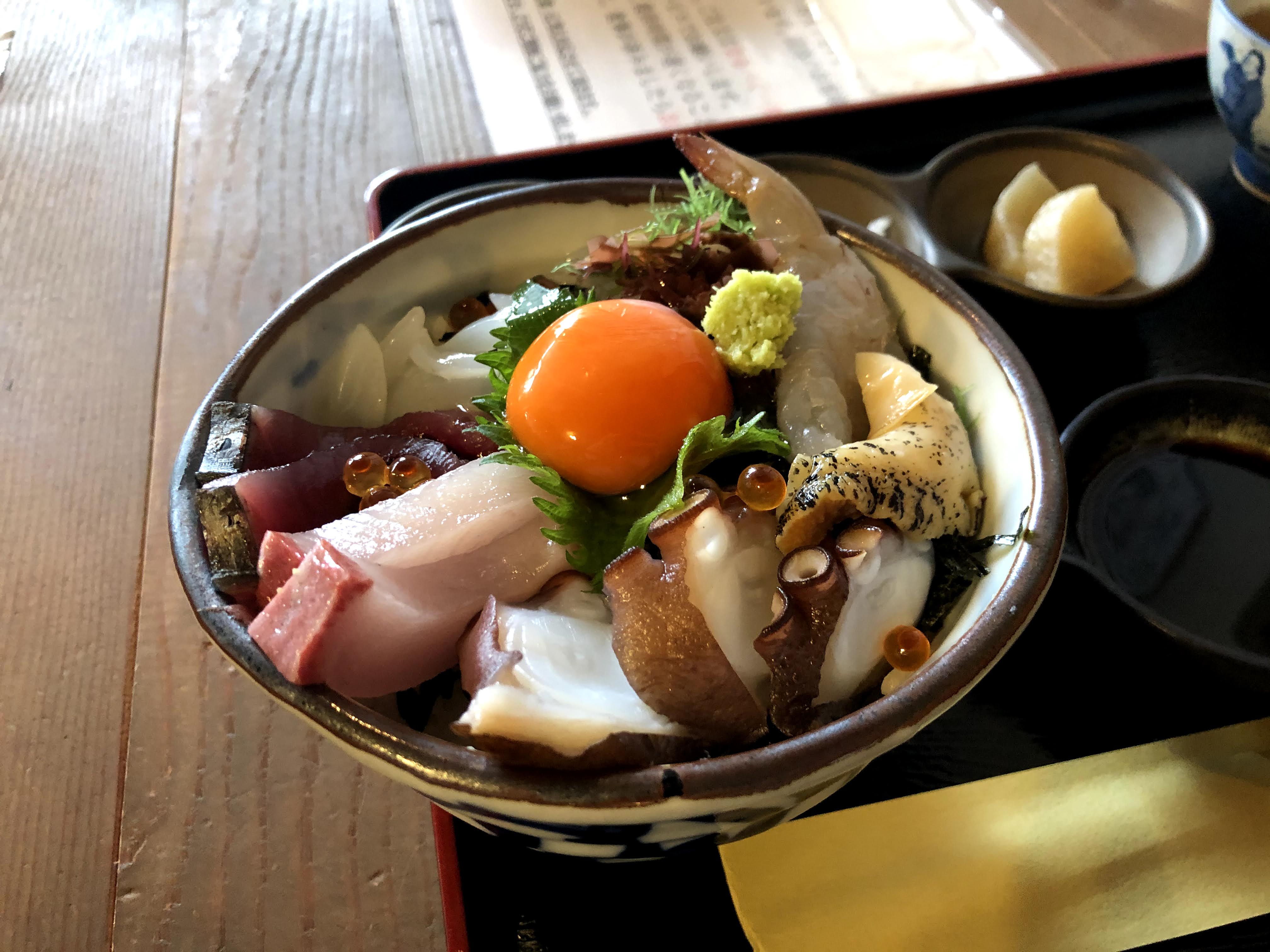 Two islands later on Ōmishima, you can find a 35-year-old seafood restaurant, Yoshikawa (よし川). Their kaisendon teishoku (海鮮丼定食) for ¥1,400 gives you the best bang for buck, with the chef’s selection of the freshest seafood from the Seto Inland Sea (瀬戸内海 Seto Naikai) topped with a raw egg yolk. You’ll get a good mixture of local fish, shellfish, and best of all, it’s complemented by their in-house dashi shōyu (出汁醤油) made with a blend of ikura (いくら fish roe), kaki (牡蠣 oysters), and ika (イカ squid).