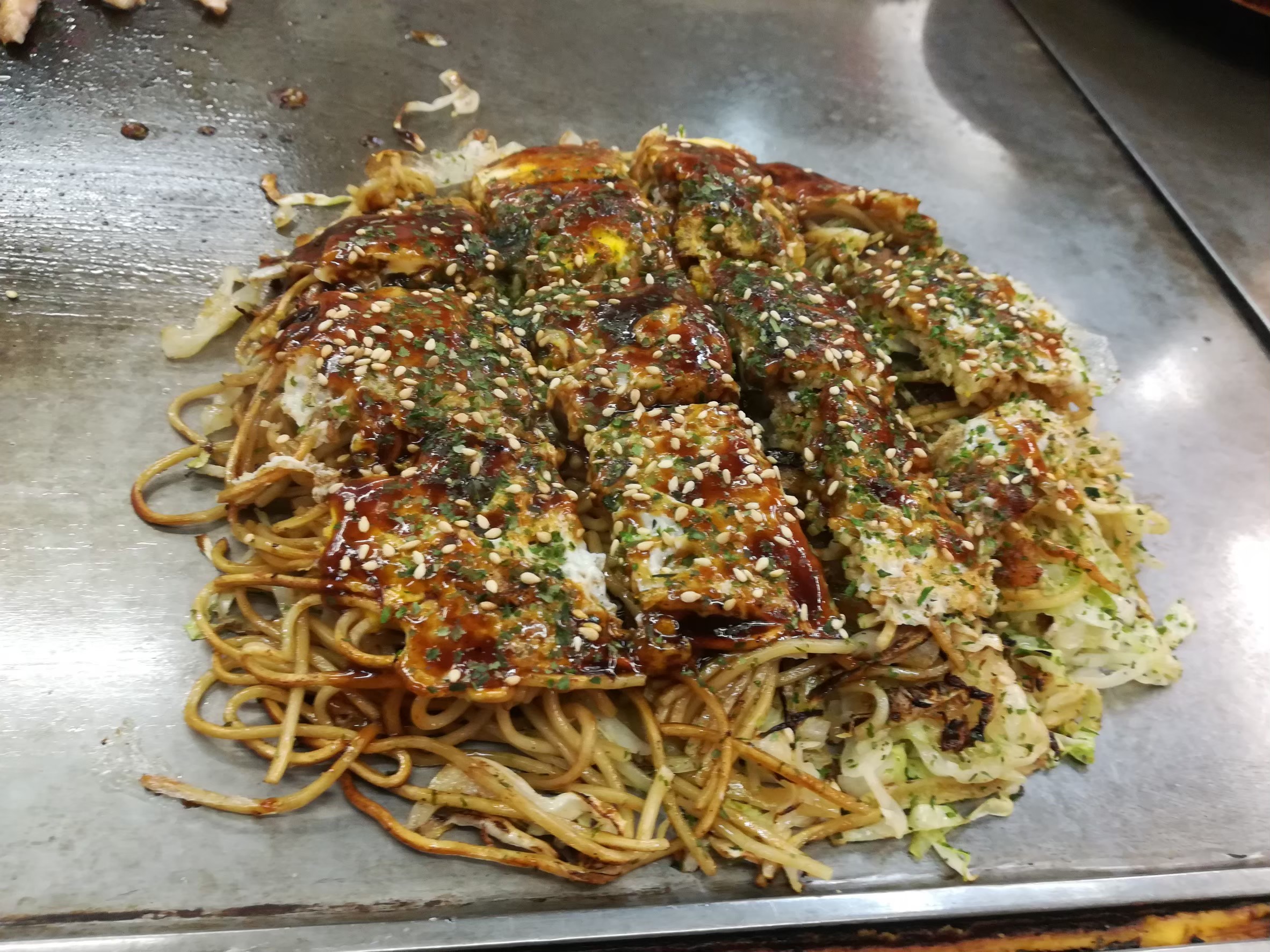After the game, I visited Okonomimura (お好み村) to have the famous Hiroshima dish okonomiyaki (お好み焼き). There are 25 restaurants in this huge building and my friend recommended Hakkai (八戒) which is located on the 4th floor. As expected, the okonomiyaki was delicious due to the variety of ingredients and big portions. I had one question while I was eating—what is the difference between Hiroshima and Osaka’s okonomiyaki? Both of these savoury pancakes taste the same to me!