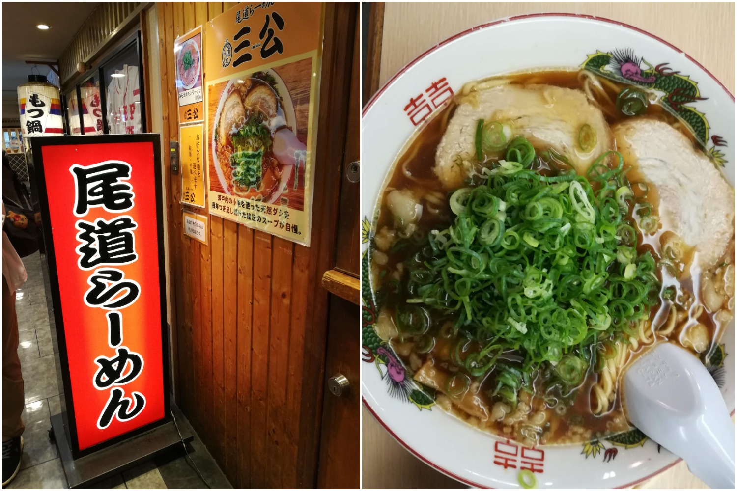 For the next part of my trip, I arrived back to Hiroshima Station (広島駅 Hiroshima-eki) to go to Yamaguchi. However, as it was a bit late, we decided to have dinner near the station before departing. We chose to eat Onomichi Ramen (尾道ラーメン) at this restaurant called Sanko (三公). This ramen is served around Onomichi City (尾道市 Onomichi-shi) in Hiroshima Prefecture and the main characteristic is that it consists of soy sauce-based broth and includes lots of pork and spring onions. I suggest you try it when you go to Hiroshima as you will be deeply moved by the rich and wonderful scent of soy sauce, which was clearly different from other ramen that I’ve had before.