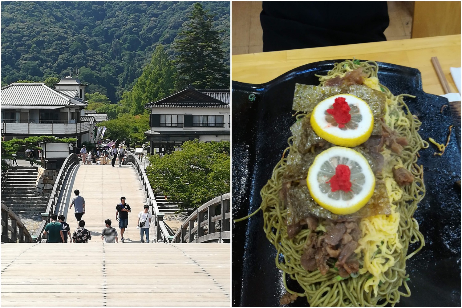 Then I headed to another bridge: Kintaikyo Bridge (錦帯橋 Kintai-kyō), which is one of the three major bridges in Japan. The elegant, wooden bridge with five high arches allows you to cross over the Nishiki River (錦川 Nishiki-gawa). Across the bridge, I ate Kawara Soba (瓦そば) which is Yamaguchi’s most famous dish. Kawara means roof tile, which is what the soba is cooked on. When hearing the word soba, most people might think of greyish coloured noodles. However, kawara soba noodles are coloured green, because matcha (抹茶) is kneaded into it. Therefore, you can enjoy the scent of tea and also lots of toppings that are different from your usual soba toppings