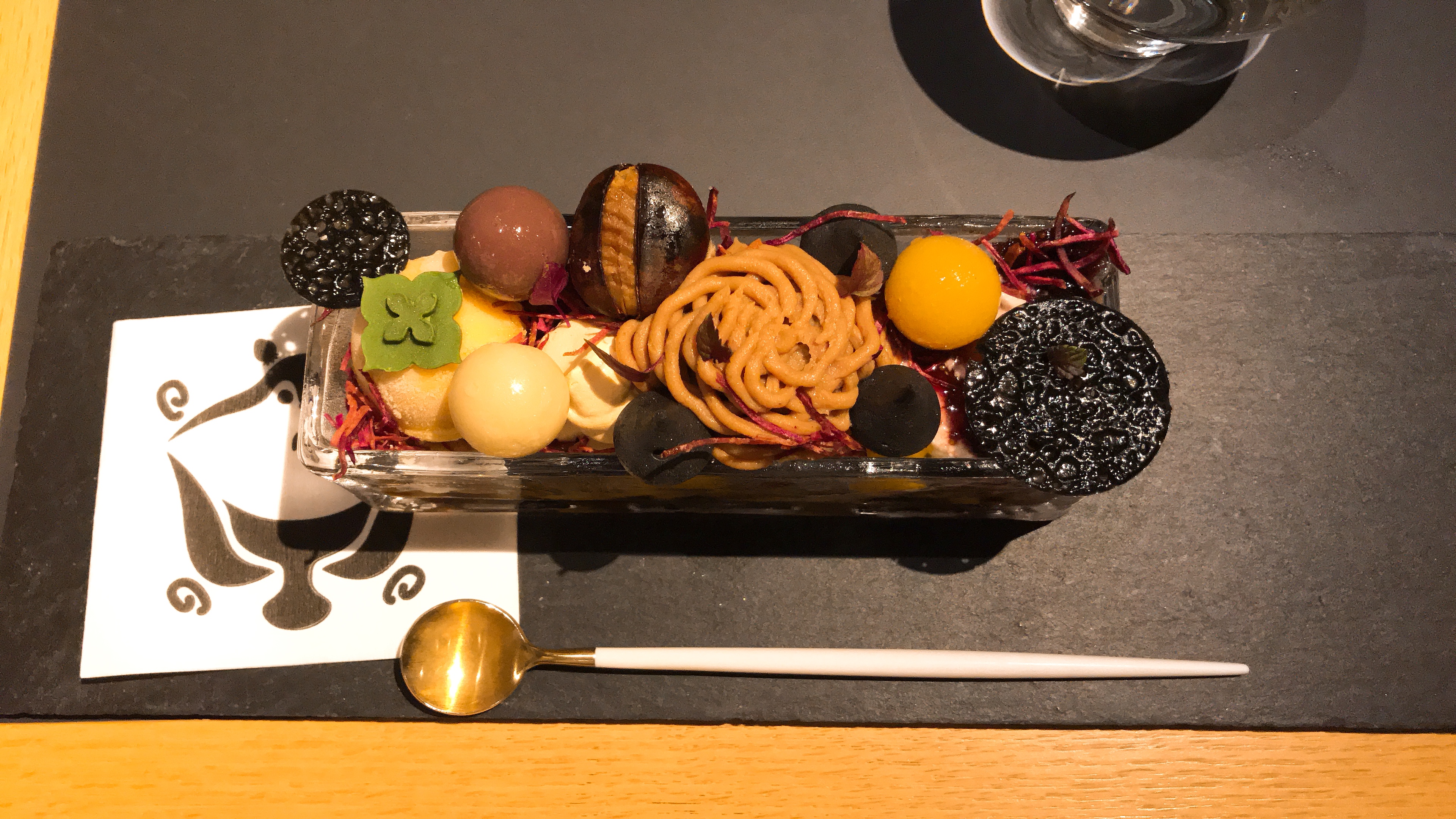 The shop serves some new flavours seasonally, so I ordered the Aki-Hirioi-Bonbon (秋拾いボンボン Autumn-picking-bonbon). As its name suggests, this parfait includes classic autumn ingredients like persimmon sorbet, fig, soft cream, pumpkin pudding, dried and sliced purple potato, and so on. Those ingredients go well together and bring a delicate and rich autumn flavour. I promise this parfait will be totally different from the ones you’ve ever had!
