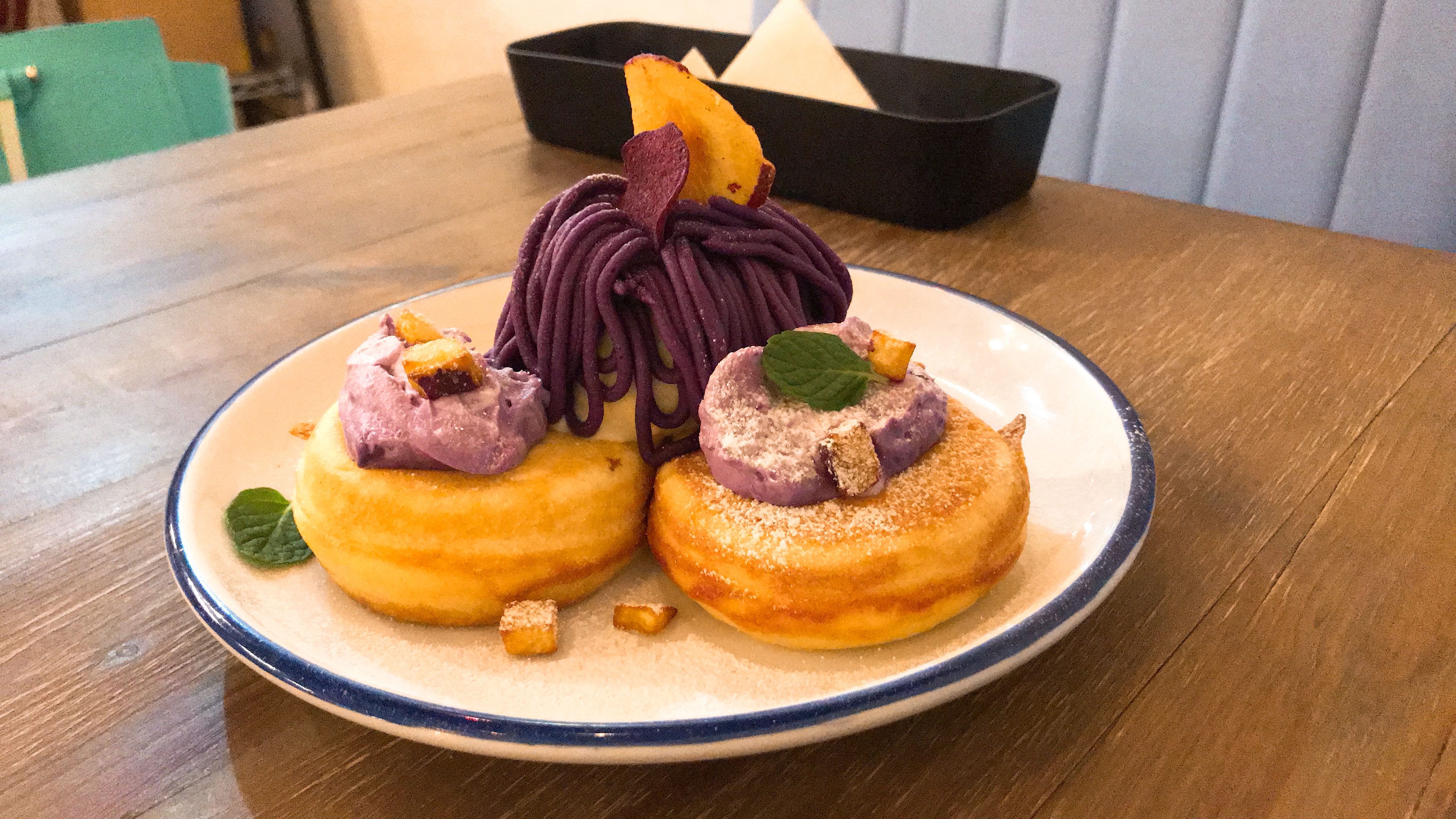 The third one is a very instagrammable pancake from a cafe called “DIORAMA CAFE”. Located just a 5-minute walk away from Ikebukuro Station West Exit, this cafe is famous for its variety of pancake menu and homemade sweets, like puddings and cakes. As an autumn special, the cafe started selling the seasonal Purple Mont Blanc Pancake from the start of October and it will last until 30th November.