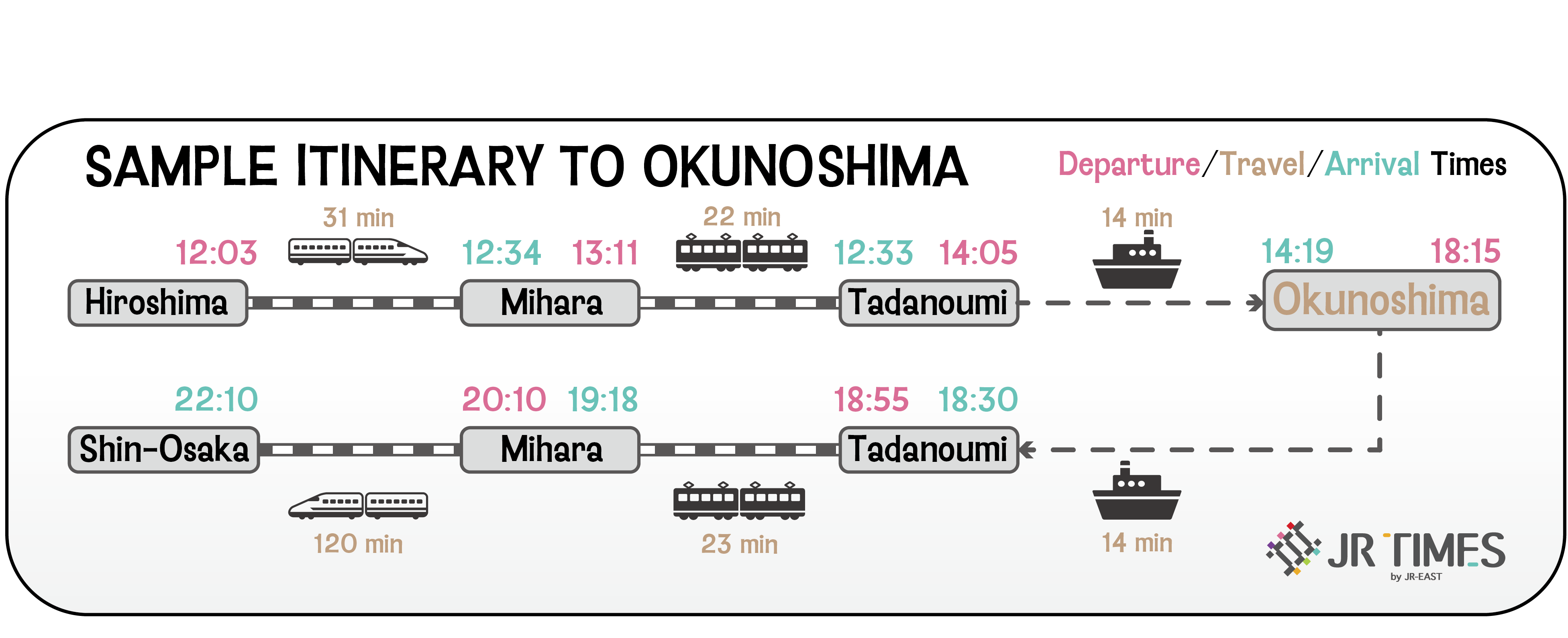 Excluding the ferry, every leg of this trip is covered by the JR Nationwide Pass, Kansai-Hiroshima Pass, and the Sanyo-San’in Area Pass, so consider getting a suitable JR Pass to save some money!