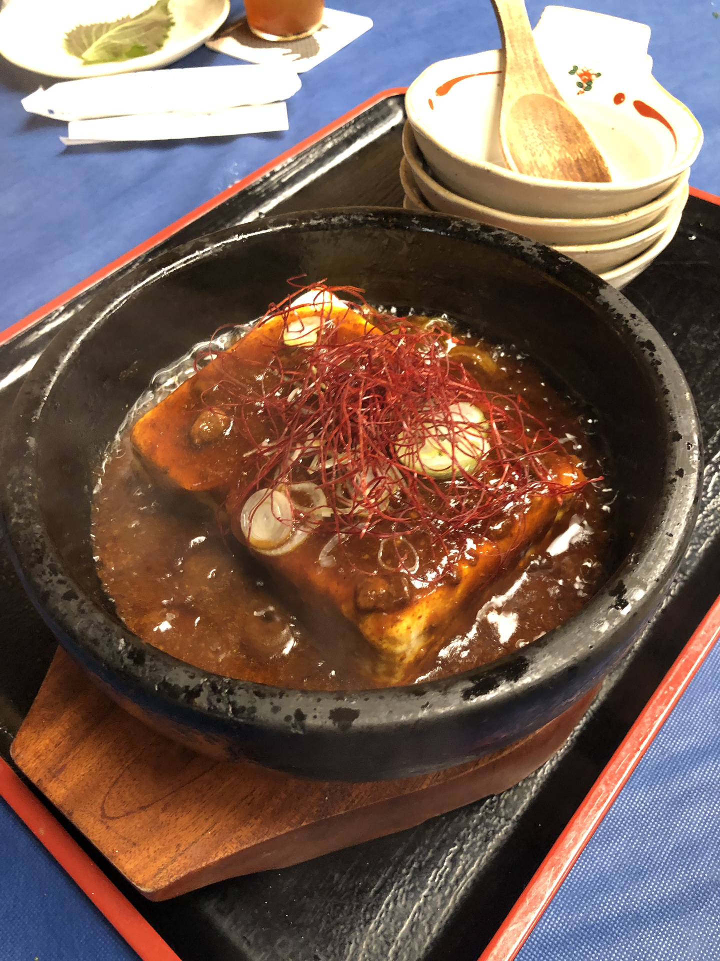 At Sushi Kou (寿し光), you can try the Shima Don (島丼) for ¥2,000 which consists of half a bowl of bekko and the other half being the local fresh catch of fish on the island. Ōshima has many tie-ups with Godzilla, including the Godzilla Mapo Tofu Teishoku (ゴジラ麻婆豆腐定食) for ¥1,000. It’s a gekikara (激辛 extremely spicy) mapo tofu (麻婆豆腐 mābō tōfu) served in a piping hot stone bowl. If you’re looking for a spice challenge in Japan, be sure to give this dish a try.