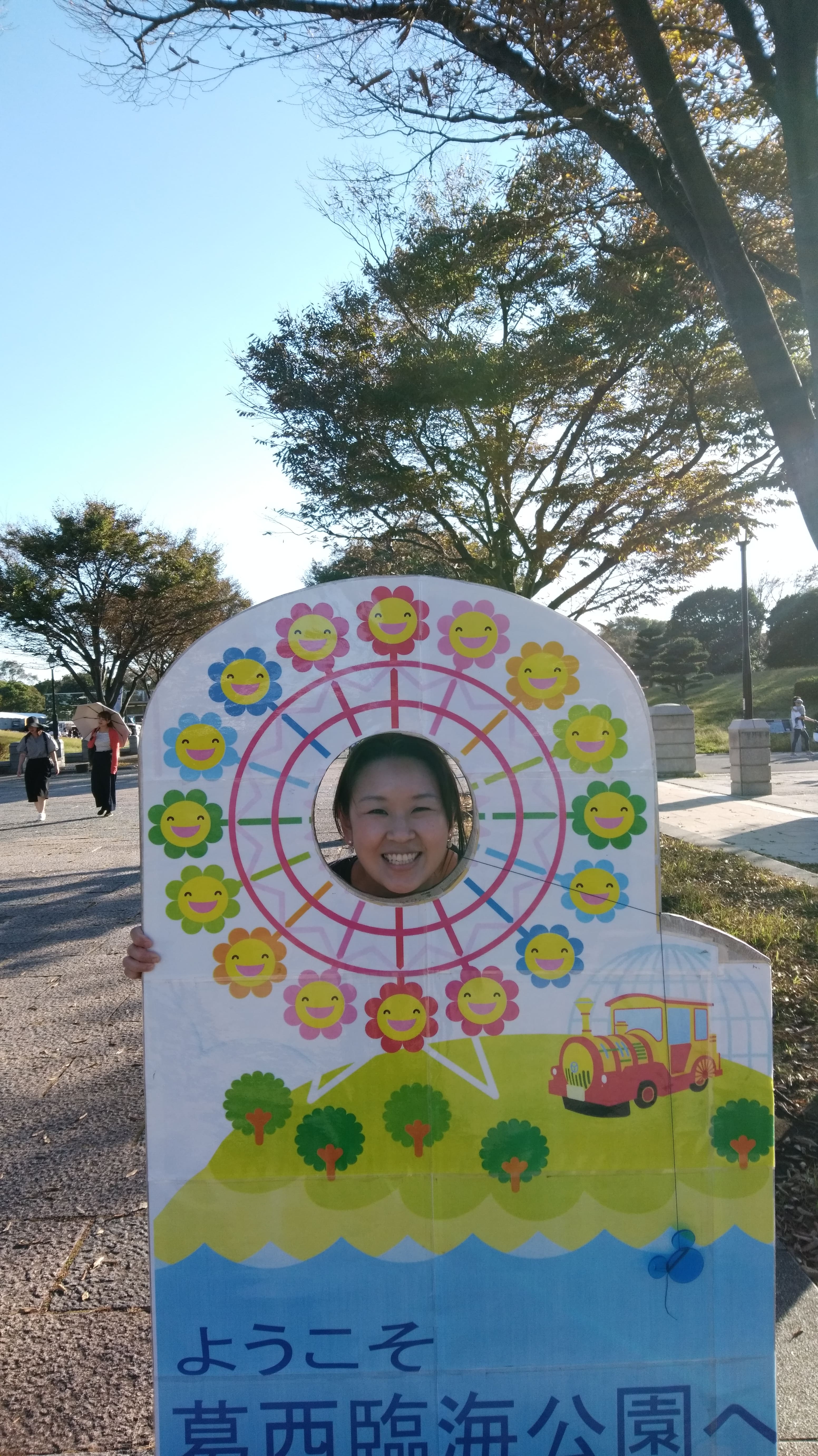 The smiling flowers symbolising the ferris wheel carriages were so adorable that I simply had to commemorate my time at the park with a photo opportunity of a cut-out signboard. In most tourist attractions in Japan, there is usually a board with a hole to stick your face in to take a photo for memories sake. This time round, the Diamond and Flower Ferris wheel, Tokyo Sea Life Park (the round globe in the background) and animal shaped trains that run around the park. Try looking for a board to take a photo with the next time you visit Japan!