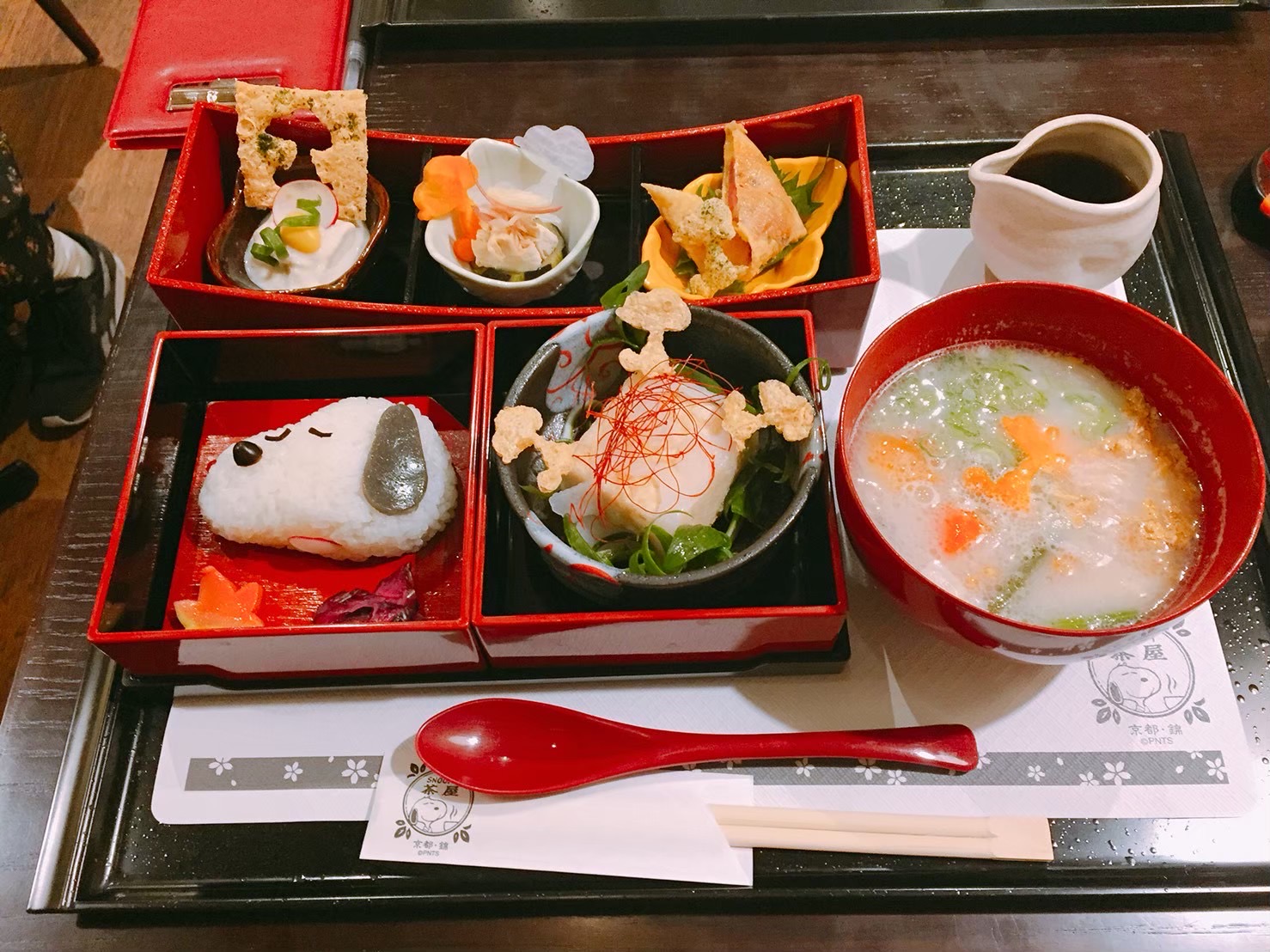 The cafe is located on the second floor. You can enjoy Snoopy themed meals and desserts made with local Kyoto ingredients. You can order desserts here, but I decided to ordered the Yuba Gozen (湯葉御膳) which is a Japanese-style tofu skin set meal. The top tray of side dishes are all made with Yuba, and right next to the Snoopy-shaped rice is a Tofu dish. Do remember to pour the dashi (出汁 Japanese soup stock) over the tofu dishes for the best flavour. The soup seen here is Kasu-jiru (粕汁), which is a Japanese soup made with sake lees from local Kyoto sake storehouse. This will surely warm you up.