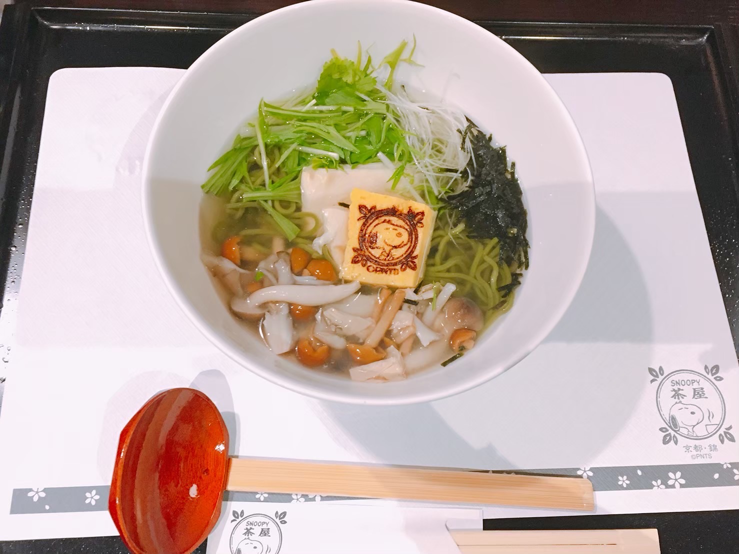 My friend ordered the warm Cha-soba (茶そば green tea buckwheat noodles). The soba features a “steak yuba”, which is a thick-cut yuba stamped with the cafe’s logo, and topped with plenty of vegetables and mushrooms. The atmosphere of the cafe is relaxing and l comfortable, and there are many little Snoopy hidden in different places throughout the cafe. For Snoopy lovers, it is just irresistible!