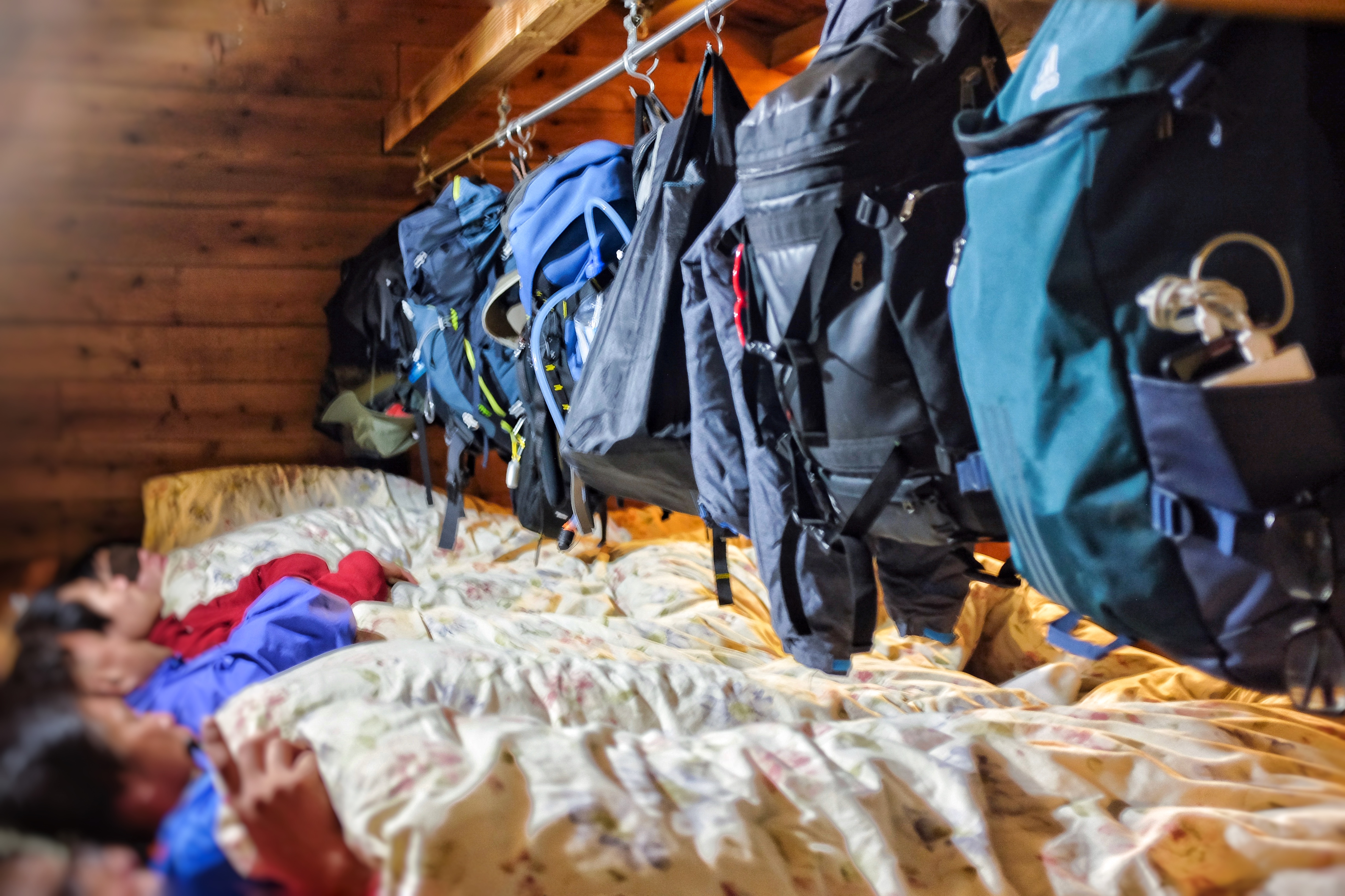 Each climber gets a tiny spot next to one another. Bags and equipment are to be hung right above where they sleep. (Image credit: JAL / Sandy)