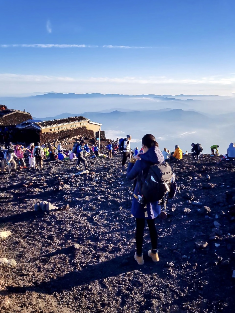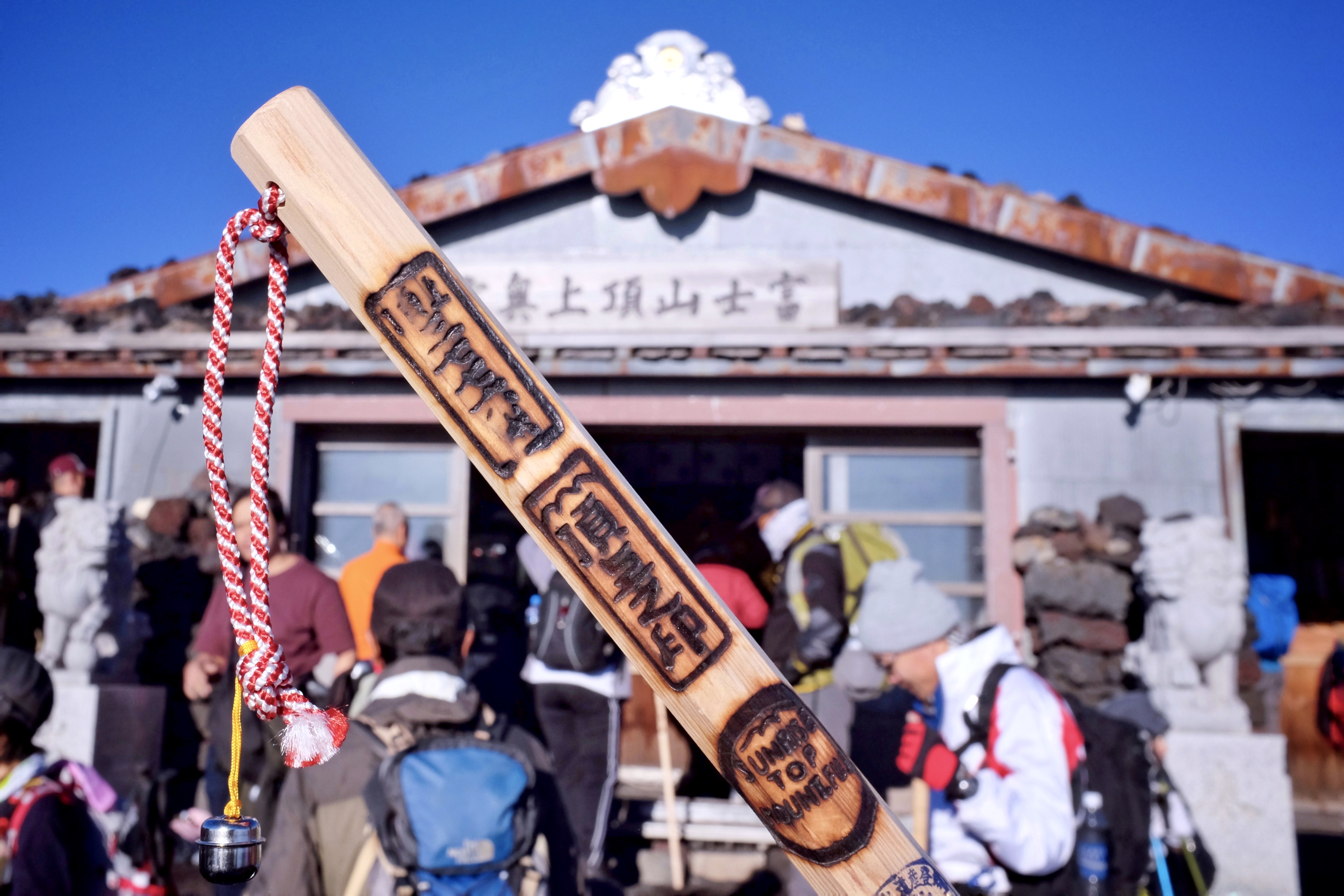 There were a few souvenir stands and a shrine up at the summit, as well as food stalls. We read that climbers with wooden climbing sticks could get their sticks branded with Mount Fuji stamps from each station along their way up. We brought ours along and managed to get the exclusive summit stamps heading back down.