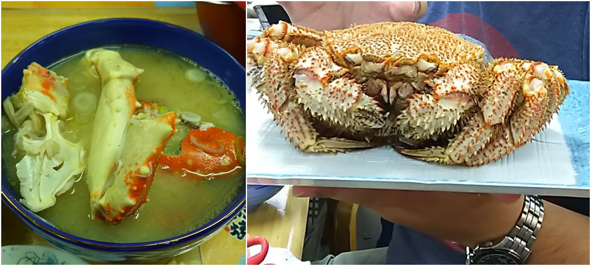 Crab galore at Sankaku Shijyo. Left: Crab miso soup that costs less than $5 (left), and a steamed hairy crab (right). (Image credit: Wanping)