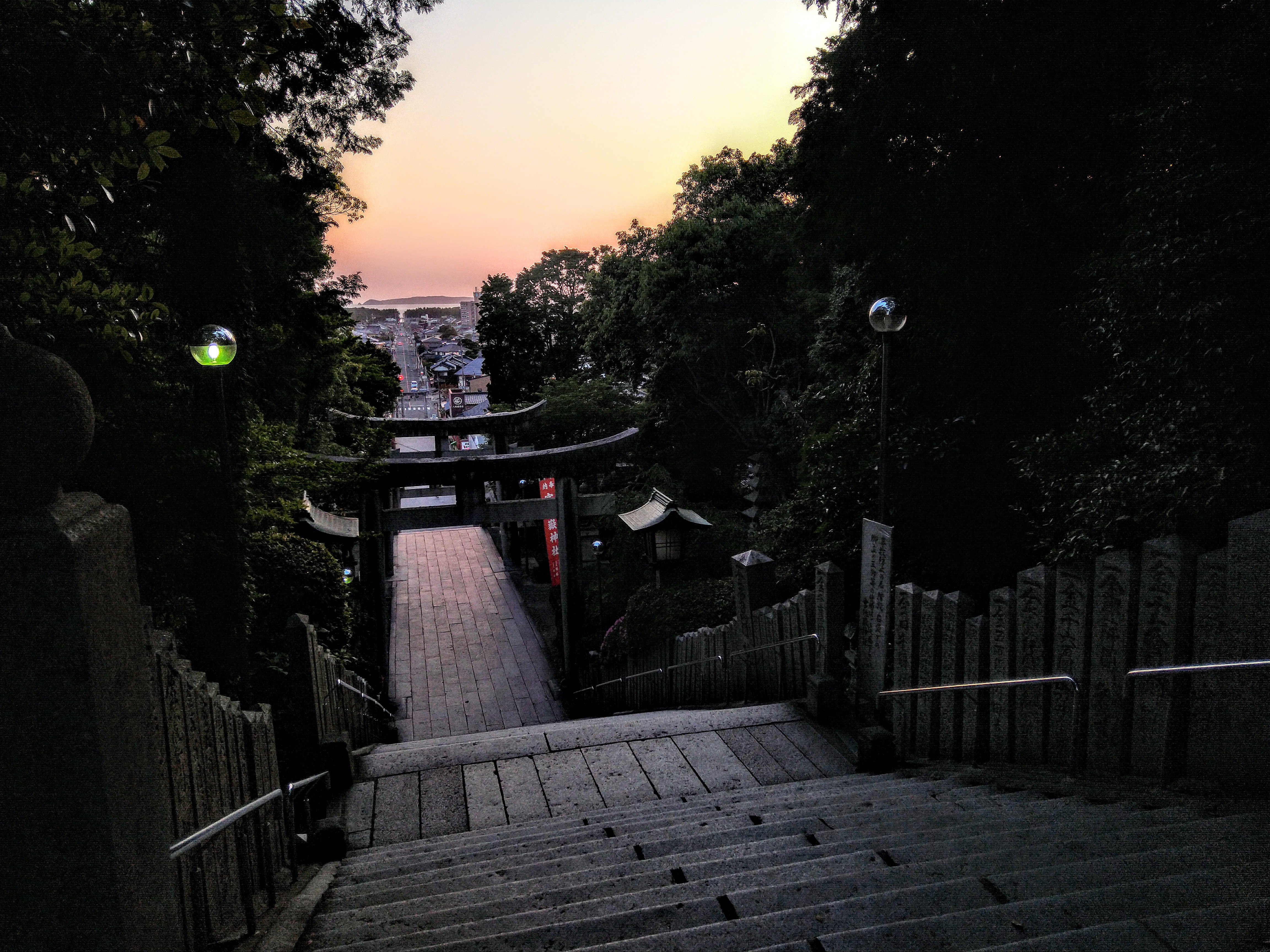 In between Fukuoka and Kitakyushu I came upon Miyajidake Shrine (宮地嶽神社 Miyajidake-jinja) in Munakata City (宗像市 Munakata-shi), famous for the dreamy sunset scenery seen from the top of a flight of stairs.