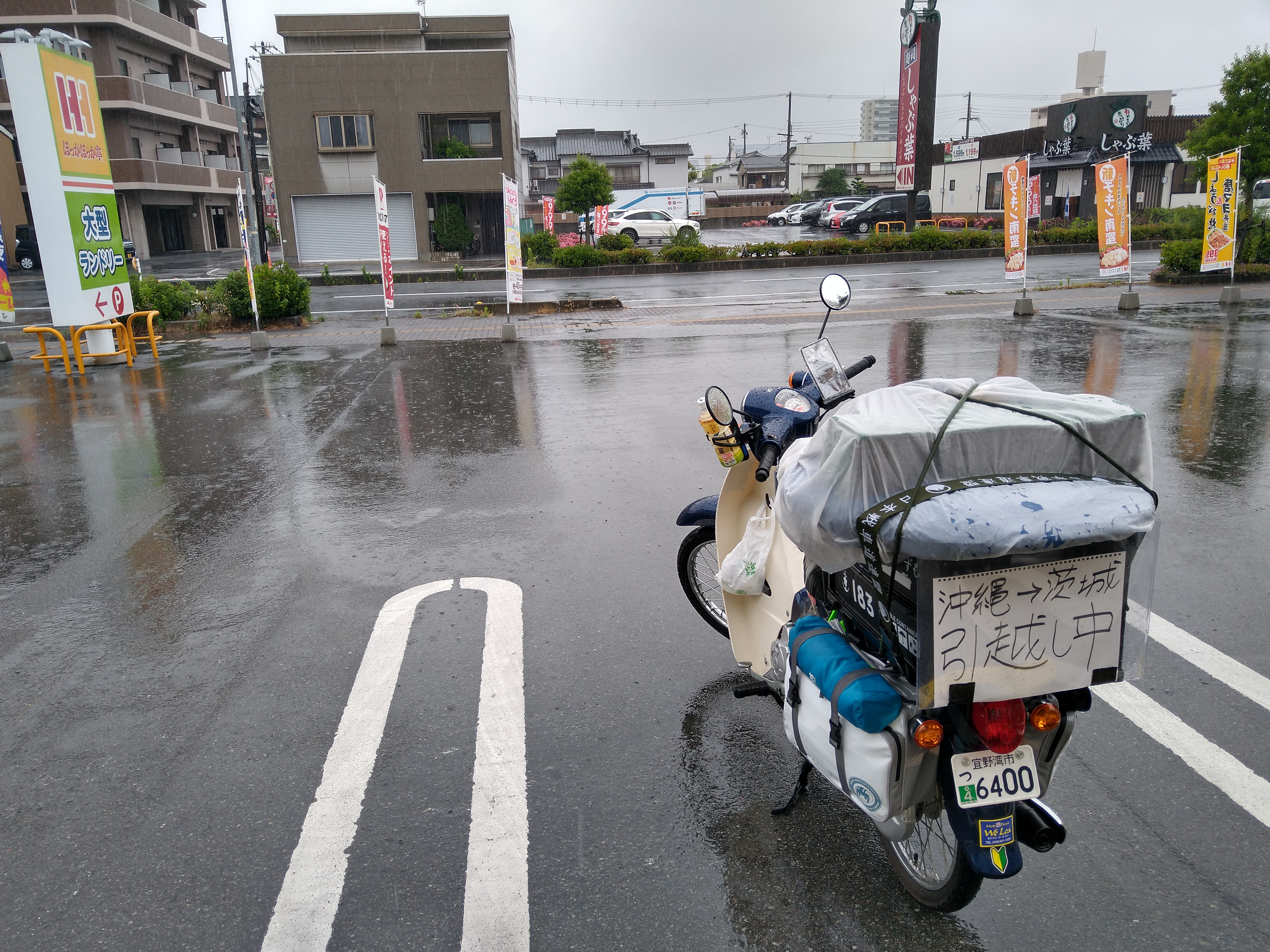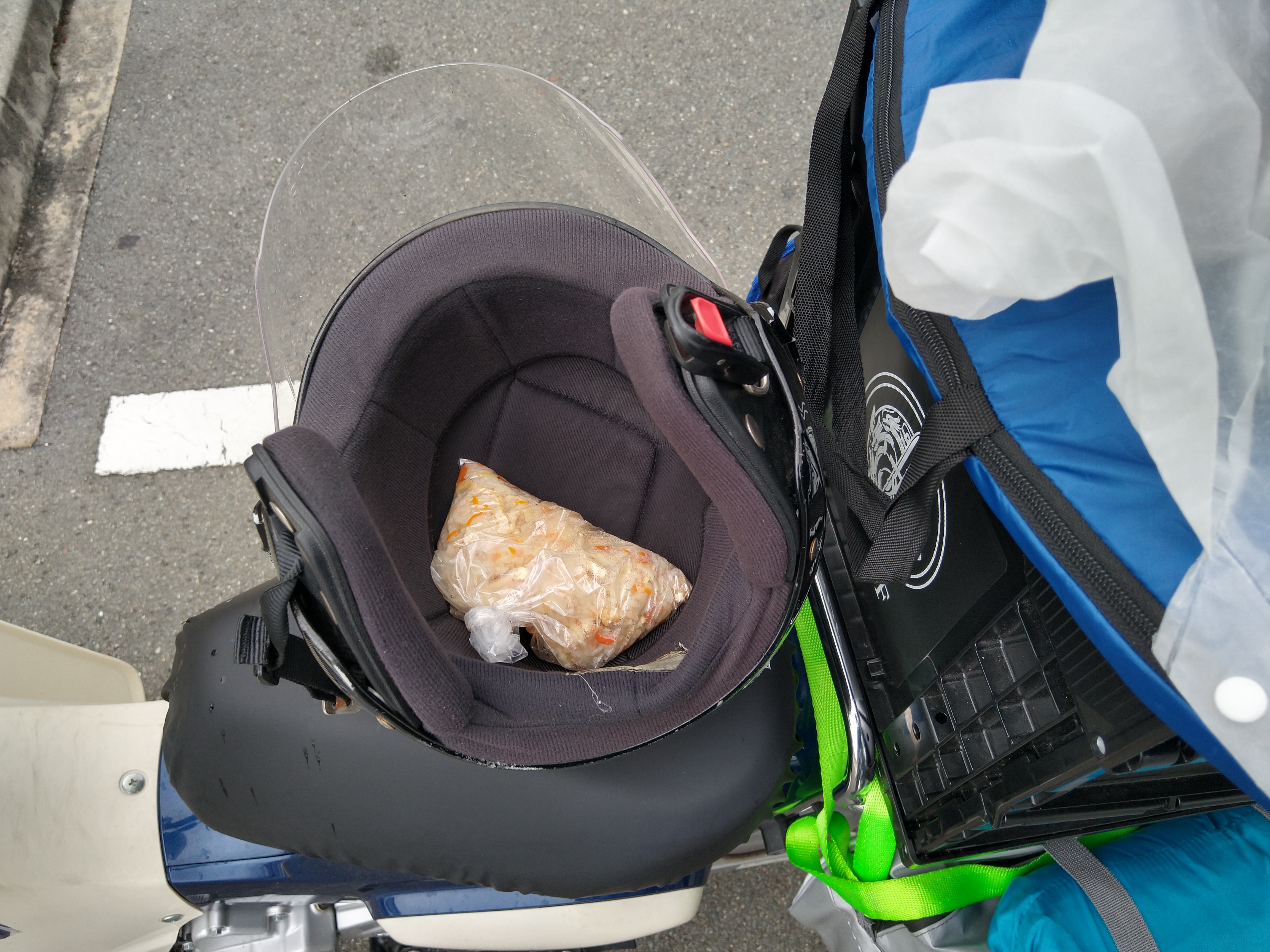 I took a bit of time off the next morning in Himeji (姫路) to settle my laundry at a coin-operated laundromat. There, I came across a nice old lady who noticed my sign and license plate and struck up a conversation with me. As it turned out, she too had once lived in Okinawa for some time. The chat was short and pleasant, and afterwards, I left to continue tending to my clothes. Later, when I walked out to my scooter, I was surprised to find a plastic bag of Okinawa-style mixed rice sitting inside my helmet. It was a gift from that nice old lady!