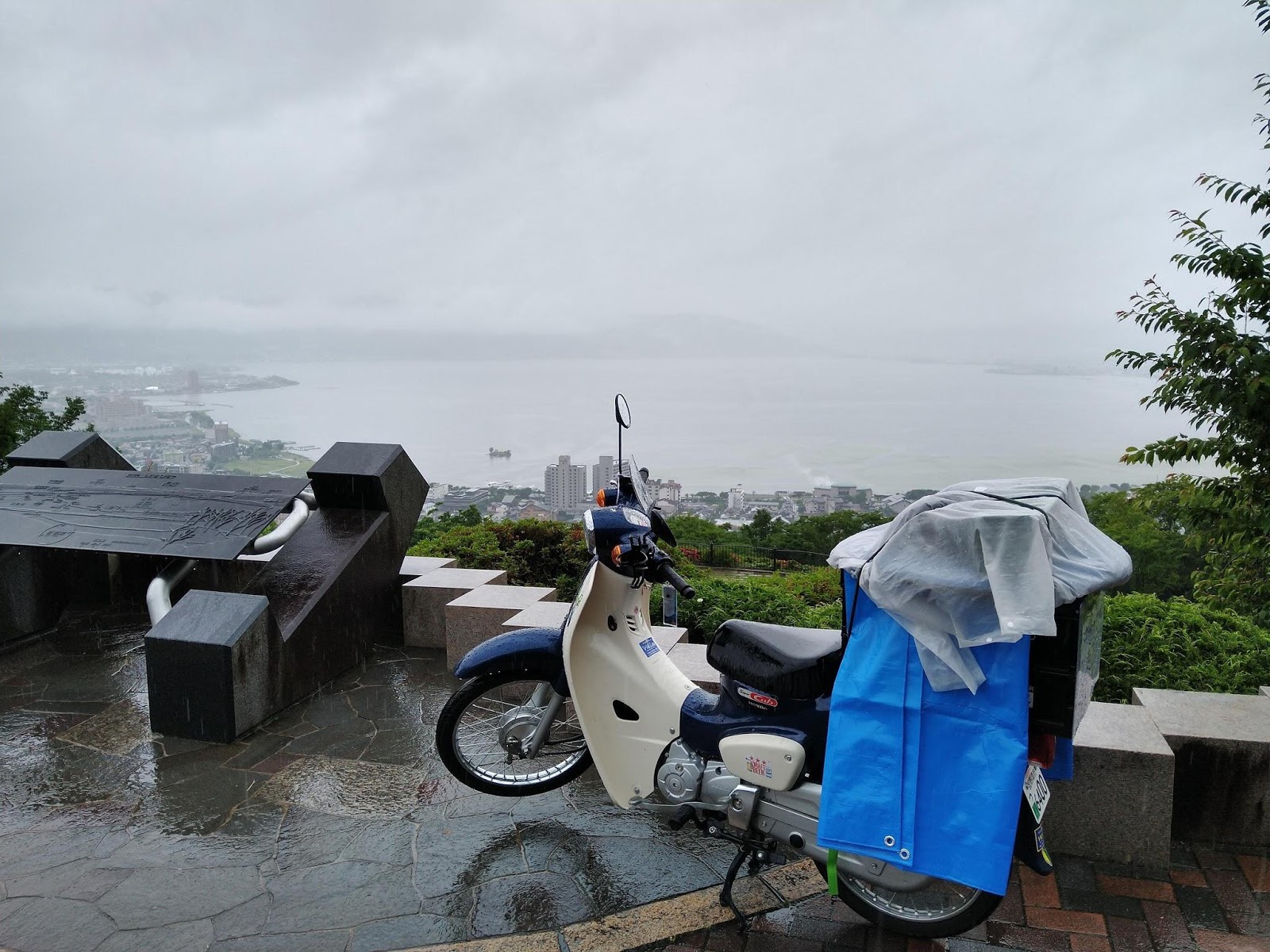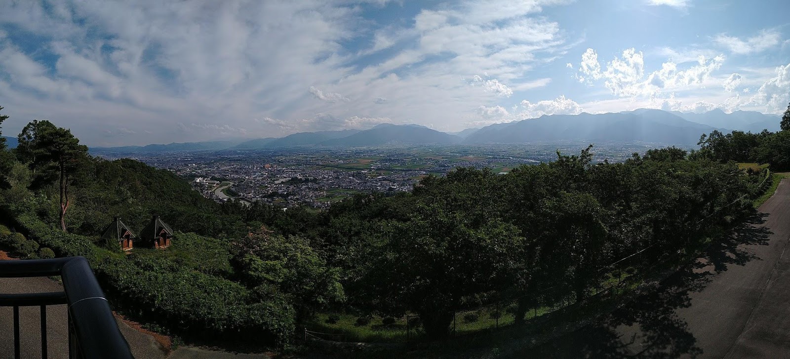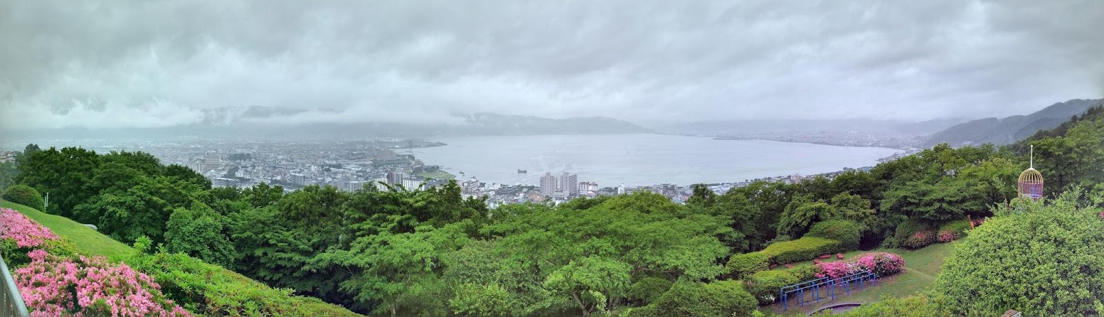 I urged my scooter up a small elevation and came to Tateishi Park (立石公園 Tateishi kōen), an observation spot that is popular among locals thanks to its prime vantage point from which one can see the main feature of Suwa City. Much to my misfortune, the gloomy weather made it hard to sufficiently capture the panoramic view in all its grandeur, so this was the best I could manage.