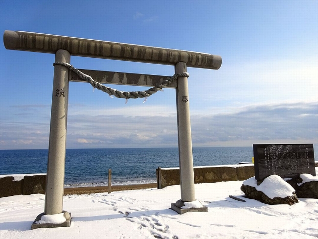 The torii at the entrance of Misogi-Hama, the beach where the main event of the Kanchū Misogi Festival occurs. (Image credit: 函館市公式観光情報サイト「はこぶら」)
