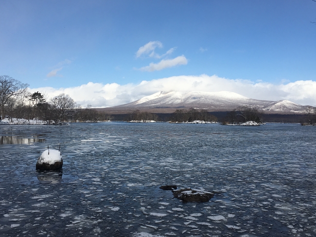 Ōnuma partially frozen over, with Hokkaido Komagatake in the background. (Image credit: Kevin Koh)