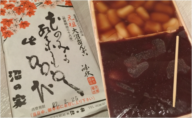 For those who prefer something sweet, how about taking away a box or two of Ōnuma dango (大沼だんご)? Unlike regular dango, which are fairly large and round, Ōnuma dango are small, and come blanketed under a layer of mitarashi sauce (みたらしタレ mitarashi-tare), a sweet-salty soy sauce-based sauce, red bean paste, or black sesame paste. They are so presented because the layer of topping is said to resemble the waters of the ponds, and the dango the many islands that can be found in the ponds. Although there are two manufacturers of Ōnuma dango, Numa-no-ya (沼の家) is the original maker, though the other, Taniguchi Sweets Shop (谷口菓子舗 Taniguchi-kashi-ho), does sell all three flavours together in a box, unlike Numa-no-ya which offers only two.