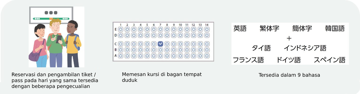 Selain itu, para wisatawan sebelumnya harus mengambil tiket yang sudah dipesan sebelum jam 9 malam, satu hari sebelum keberangkatan. Dengan sistem reservasi yang baru, wisatawan dapat mengambil dan menggunakan tiket yang sudah dipesan bahkan hingga 6 menit sebelum keberangkatan (*tidak termasuk beberapa reservasi).