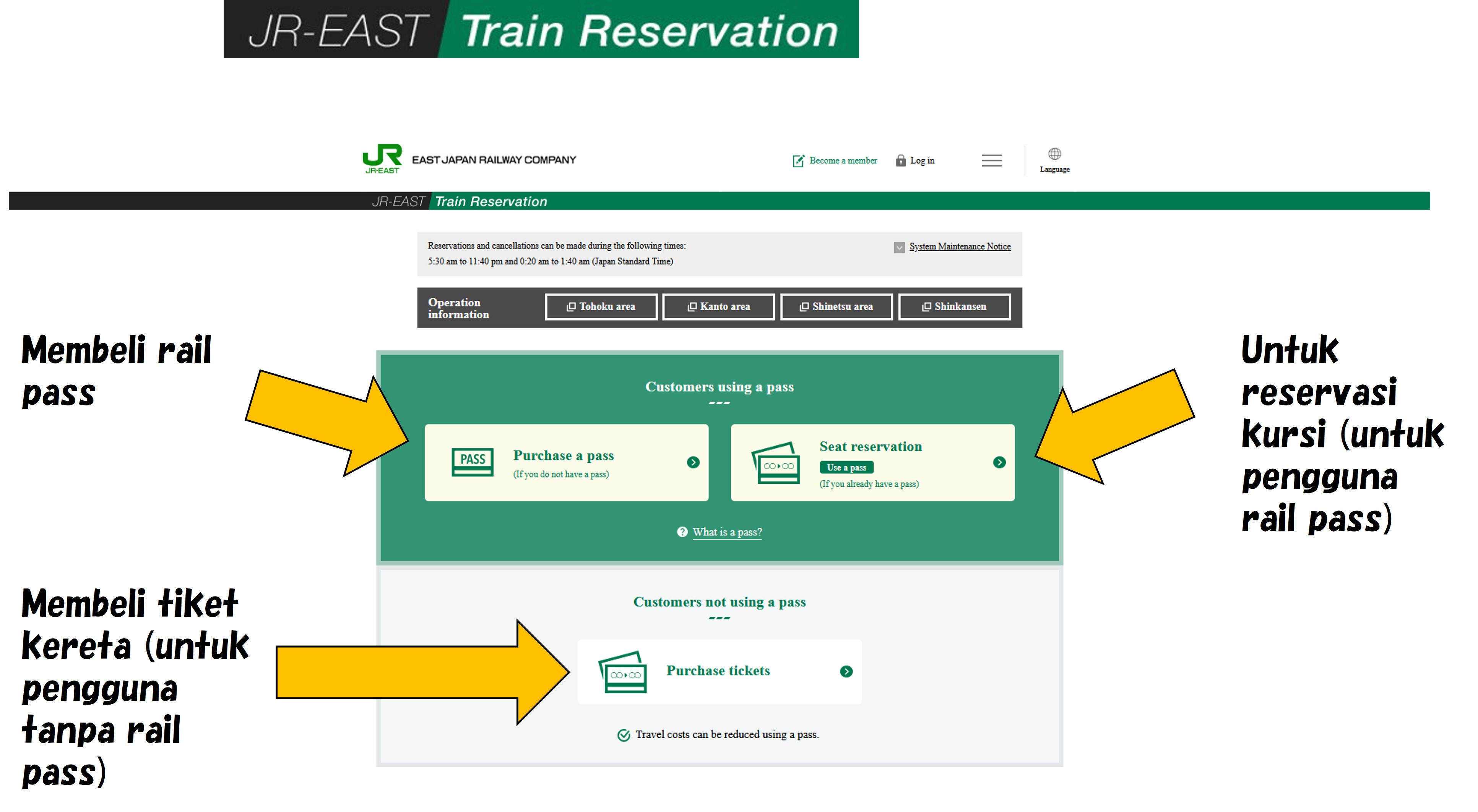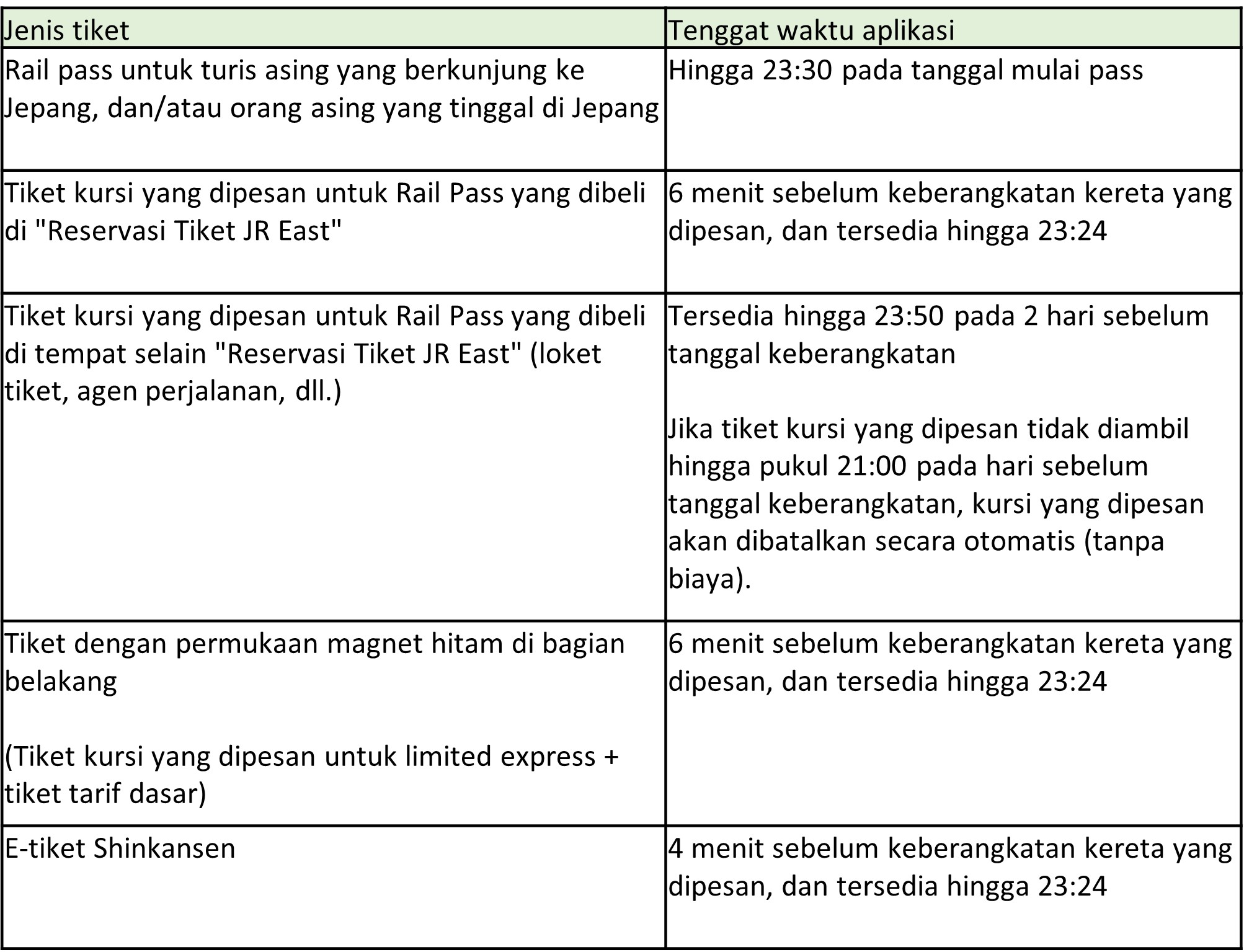 Selanjutnya, 「JR-EAST Train Reservation」 tersedia dari pukul 05:00 hingga 1:50 keesokan harinya (tidak termasuk pukul 23:50 hingga 12:10) (Waktu Standar Jepang). *Jam operasional atau batas waktu pembelian / pemesanan akan berbeda tergantung jenis layanan. Untuk informasi lebih jelas mengenai jenis tiket dan batas waktu masing-masing, simak rangkumannya di bawah ini: