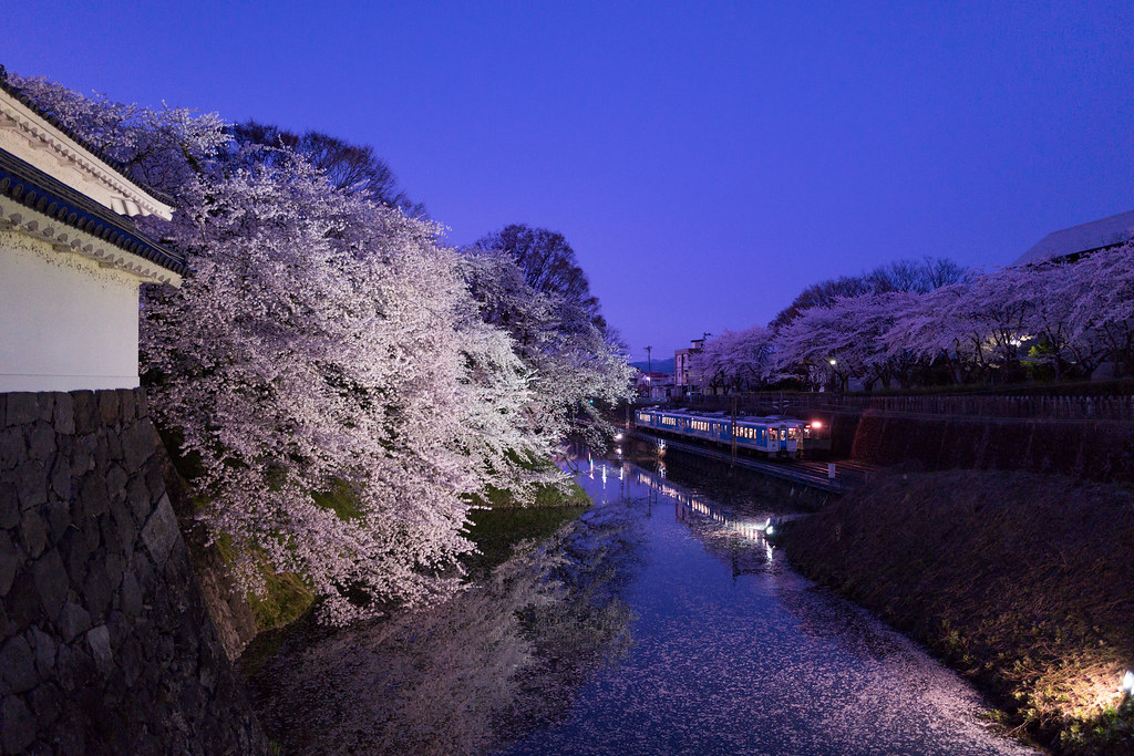 Di malam hari saat puncak mekarnya bunga sakura, pohon sakura menyala, menciptakan pemandangan yang indah saat terpantul di air parit yang tenang. Karena parit memiliki air yang relatif tenang, setelah kelopak sakura jatuh dari pohon, mereka jatuh ke dalam dan menumpuk di parit, membentuk karpet sakura merah muda. (花筏 hana ikada).