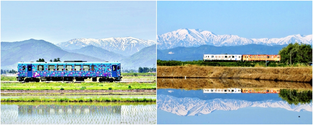 Masih di Prefektur Yamagata, berikutnya kami tidak memiliki tempat yang spesifik, tetapi seluruh jalur kereta—Jalur Flower Nagai Yamagata Railway (山形鉄道フラワー長井線) sepanjang 30.5km—untuk menikmati pemandangan kereta dan bunga. Pemandangan paling terkenal adalah yang ditampilkan diatas, menampilkan kereta api yang berjalan di samping pohon sakura, dengan Pegunungan Asahi yang diselimuti salju sebagai latar belakangnya. Pemandangan ini dapat dinikmati tepat setelah kereta melintasi Mogamigawa Kyо̄ryо̄ (最上川橋梁), jembatan kereta api tertua di Jepang, yang berjarak sekitar 15 menit berjalan kaki dari Stasiun Arato (荒砥駅).