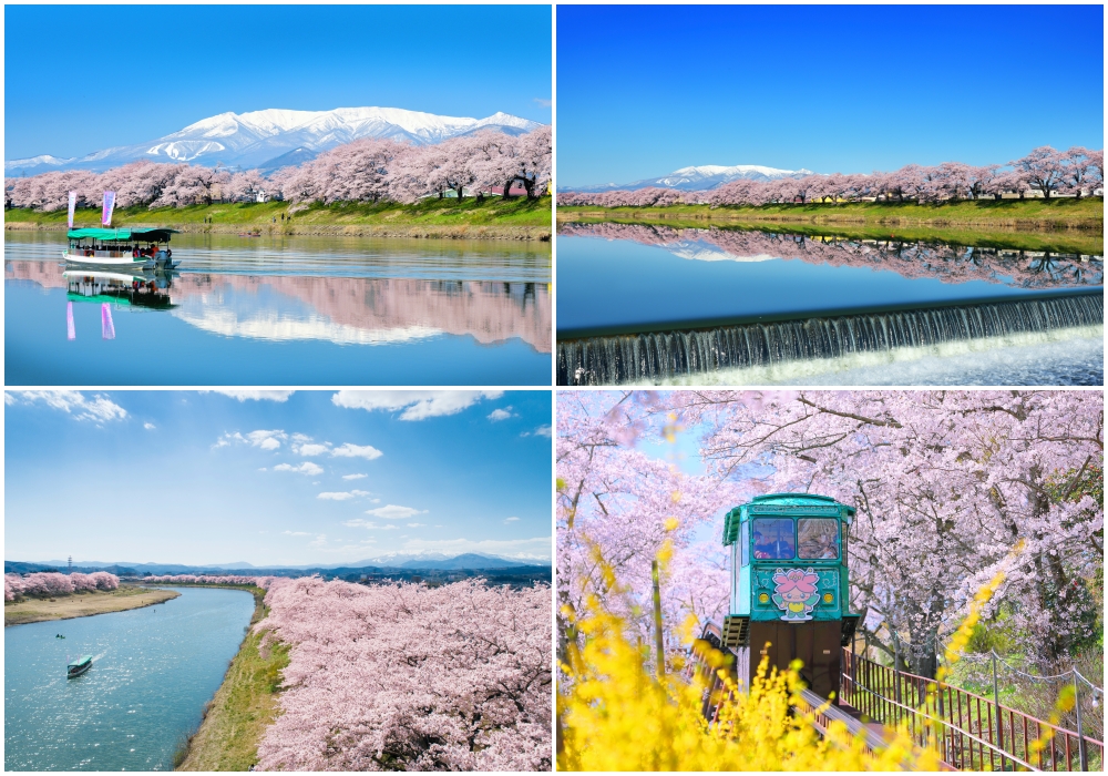 Selanjutnya, kita menuju selatan ke tepi Sungai Shiroishi (白石川) di Prefektur Miyagi, ke tempat yang disebut Hitome Senbonzakura (一目千本桜), yang memiliki nama yang secara harfiah berarti “1,000 pohon sakura dalam satu pandangan”. Pemandangan megah dari kereta api yang berjalan sejajar dengan deretan pohon sakura yang tampaknya tak berujung bergoyang lembut tertiup angin, dengan Gunung Zao yang tertutup salju sebagai latar belakang, pasti akan membuat Anda terpesona! Pemandangan ini dapat dengan mudah dilihat dari atas Jembatan Shibata Senokyo (しばた千桜橋 Shibata Sen’о̄kyо̄), yang dibangun baru-baru ini pada tahun 2015.