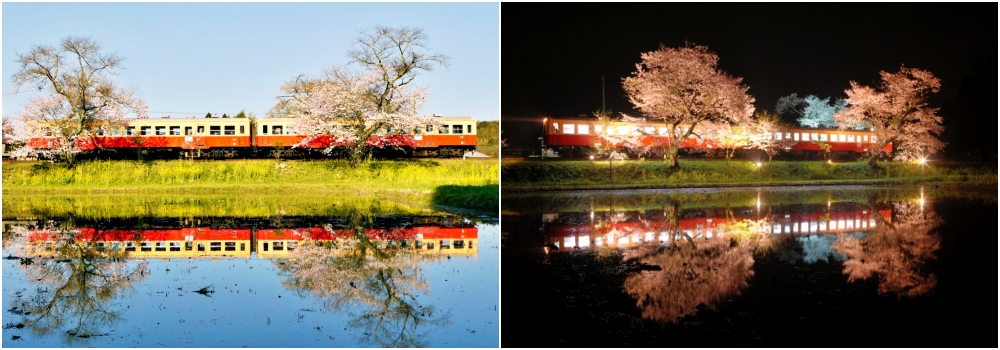 Akhirnya, sebagai penutup, di Prefektur Chiba kami memiliki Jalur Kominato Railway, yang juga menawarkan banyak kesempatan untuk menikmati sakura dan nanohana. Satu pemandangan yang tidak boleh Anda lewatkan adalah "cermin air" (水鏡 mizukagami) di dekat Stasiun Itabu (飯給駅). Di sini, air sawah yang tenang bertindak seperti cermin, memantulkan dengan sempurna kereta api yang lewat dan pemandangan sekitarnya—pemandangan yang menjadi lebih ajaib di malam hari saat pepohonan diterangi.