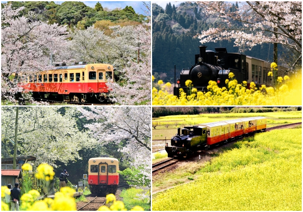 Di sepanjang Jalur Kominato, kereta api terbuka khusus—Satoyama Torokko Ressha (里山トロッコ列車)—biasanya hanya beroperasi pada akhir pekan dan hari libur nasional, tetapi selama periode mekarnya sakura dan nanohana, kereta ini juga beroperasi pada hari kerja. Berjalan dengan diesel bersih, kereta ini menampilkan kepala kereta SL tiruan, sebuah penghargaan untuk kereta SL yang dulu berjalan di Jalur Kominato.
