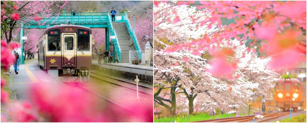 Meskipun ada banyak tempat di sepanjang Jalur Watarase Keikoku di mana Anda dapat menikmati pemandangan sakura dan kereta api, banyak yang akan setuju bahwa yang terbaik pasti ada di sekitar Stasiun Gо̄do, di mana kontras bunga sakura someiyoshino merah muda pucat dan hanamomo merah muda tua (花桃 bunga persik dekoratif) menciptakan suasana seperti fantasi. Hanamomo ini baru saja ditanam pada tahun 2000, tetapi sejak itu menjadi gebrakan besar di antara pengunjung dan penggemar kereta api tori-tetsu.