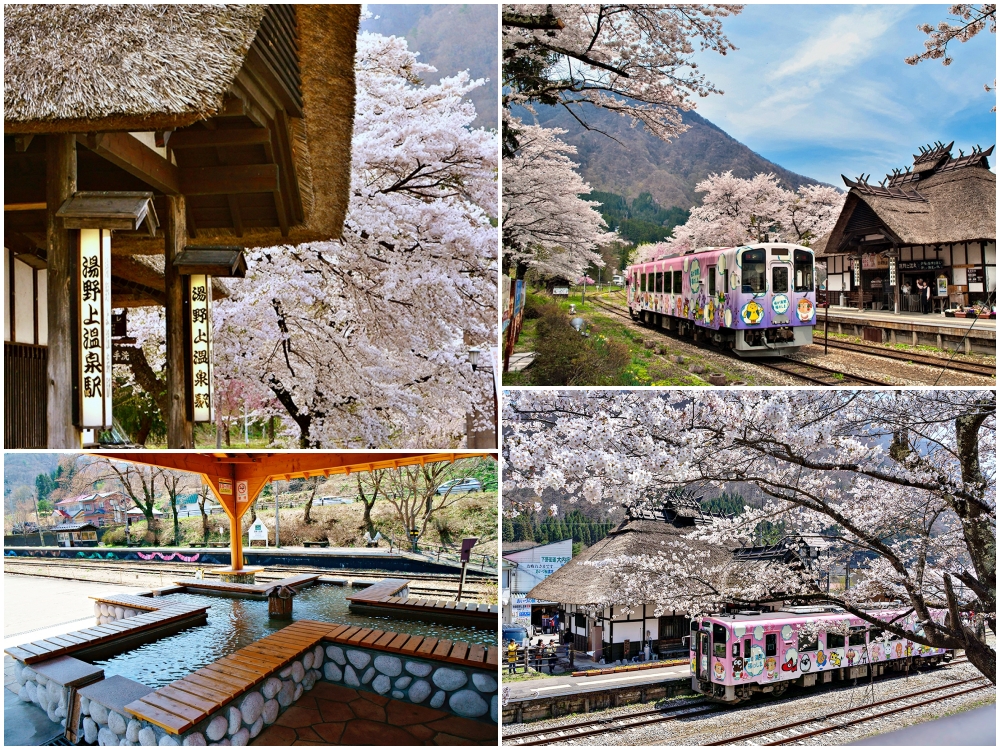Di Stasiun Yunokami-Onsen, Anda dapat menikmati pemandangan nostalgia dari kedatangan dan keberangkatan kereta bersama dengan bunga sakura someiyoshino dan atap jerami stasiun yang unik, pemandangan yang membawa Anda kembali ke masa lalu. Fitur menarik lainnya dari Stasiun Yunokami-Onsen adalah footbath nya (足湯 ashiyu), yang menghadap ke peron dan gratis untuk digunakan. Footbath sangat memuaskan untuk digunakan di musim semi yang dingin, ketika Anda dapat menikmati kehangatannya bersama dengan pemandangan bunga sakura.