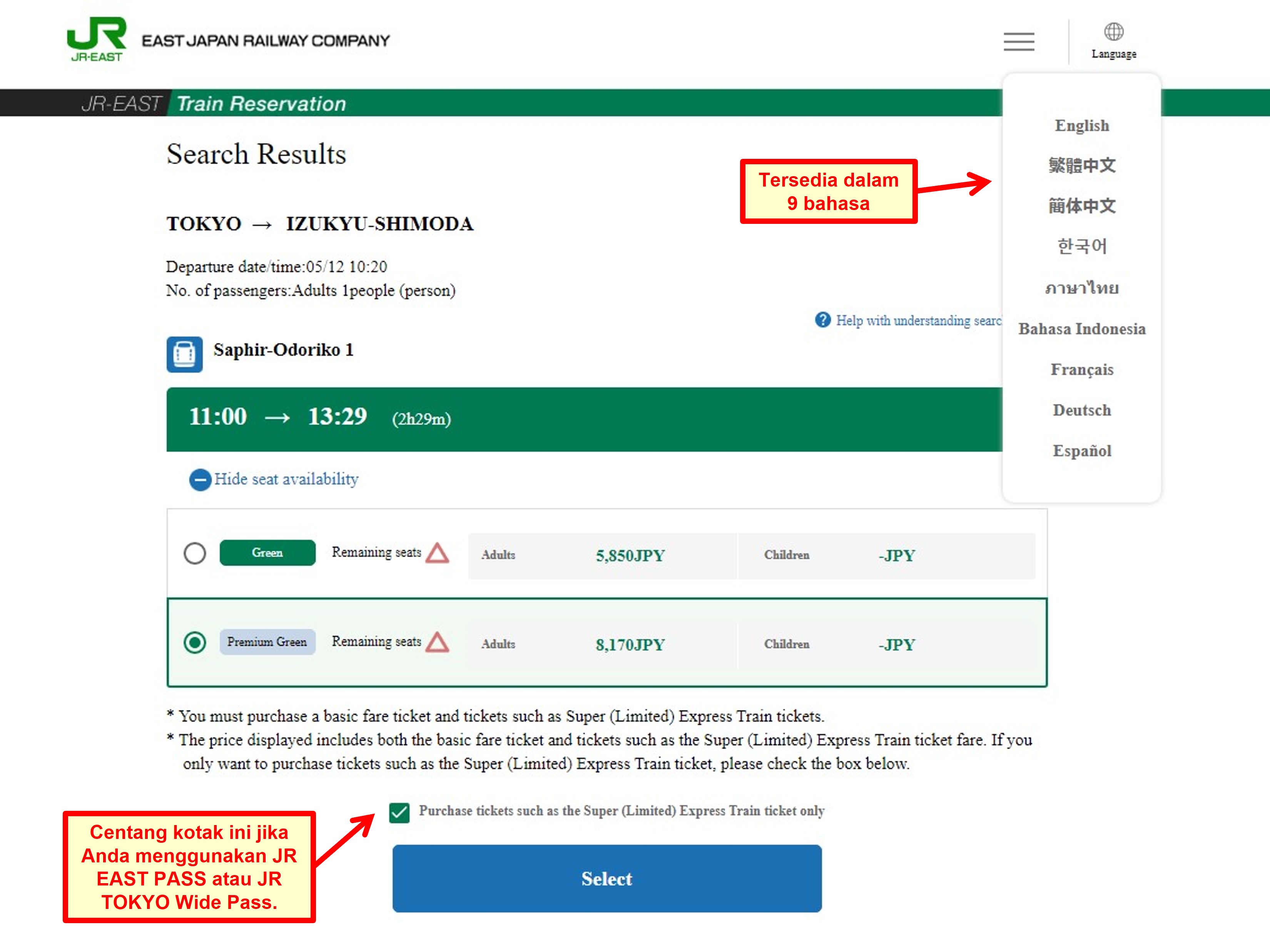 Jika Anda banyak bepergian di sekitar wilayah Kanto, pertimbangkan untuk menggunakan JR TOKYO Wide Pass, pass terjangkau yang menawarkan perjalanan kereta tanpa batas di jalur JR East (termasuk kereta peluru) di area yang berlaku selama 3 hari berturut-turut. Biaya tiketnya ¥10,180 dan bahkan mencakup Jalur Izukyūkō ke Semenanjung Izu. *JR TOKYO Wide Pass hanya mencakup tarif dasar SAPHIR ODORIKO. Penumpang masih perlu membeli tiket terpisah untuk menaiki kursi Green/Premium Green.
