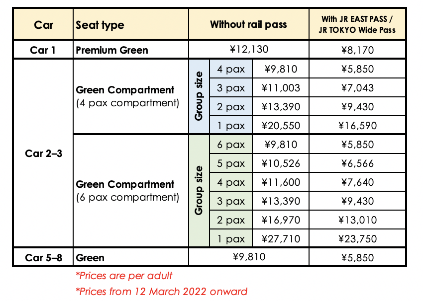 Kabar baik untuk pemegang JR East Rail Pass: jika Anda menggunakan JR EAST PASS atau JR TOKYO Wide Pass, pass tersebut sudah mencakup tarif dasar, jadi Anda hanya perlu membeli tiket untuk biaya tambahan Limited Express dan biaya tambahan Green/Premium Green —harga yang ditunjukkan di kolom paling kanan dari tabel di atas.