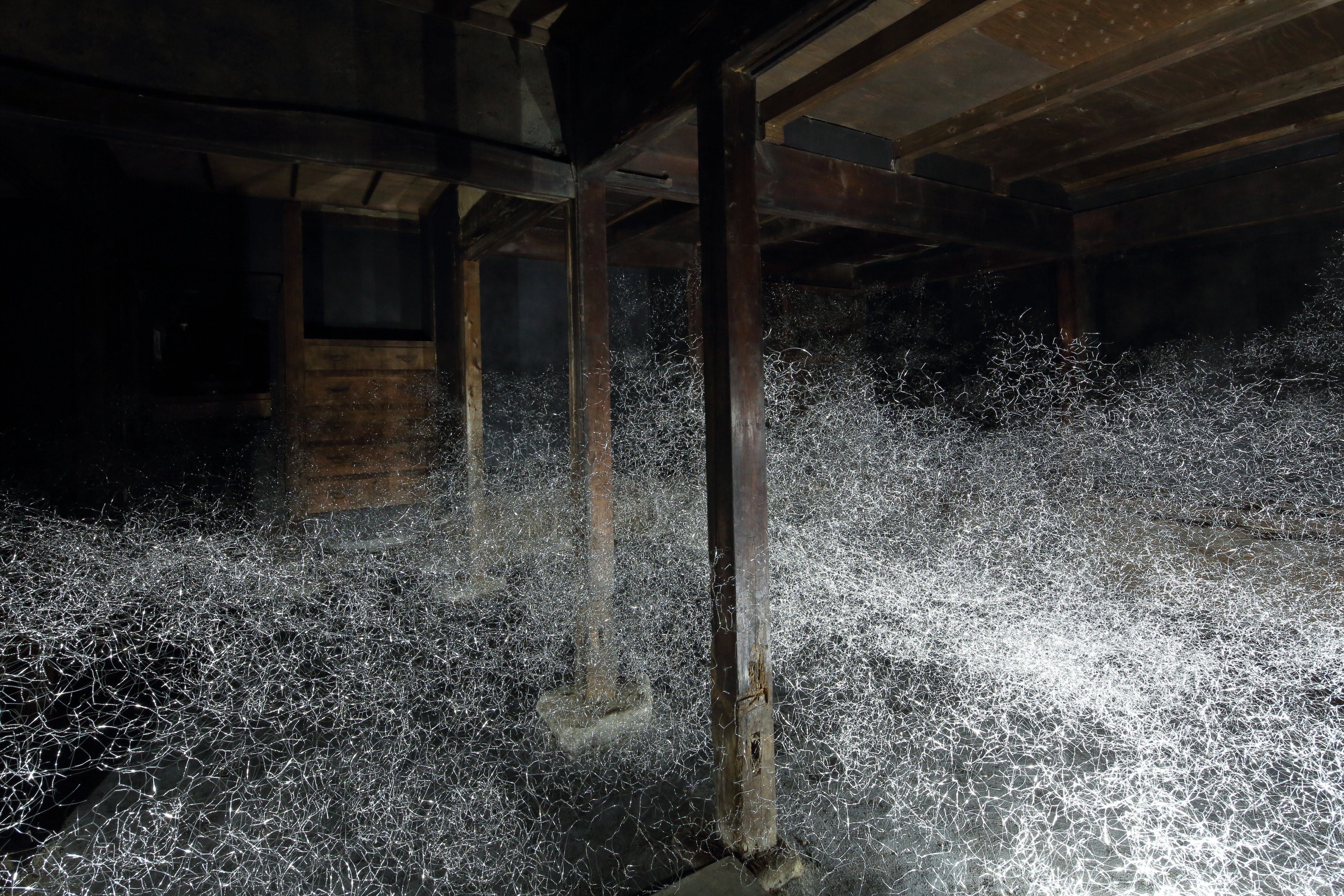 Keeping in the same vein of breathing new life into remnants of old, the Takamijima Museum has dedicated itself to preserving old houses by converting them into art spaces. The urban landscape of Takamijima (高見島) proves unique—houses cling to slopes forming staircase-like settlements, and in spring Narcissus bloom all-over, reminiscent of the island’s pyrethrum chrysanthemum cultivation history. One such converted house is Murata Nozomi’s “Remains in the Mind’s Eye”, where by interlacing thin steel wire through the space, the artist hopes to embrace the lives and memories of former inhabitants.