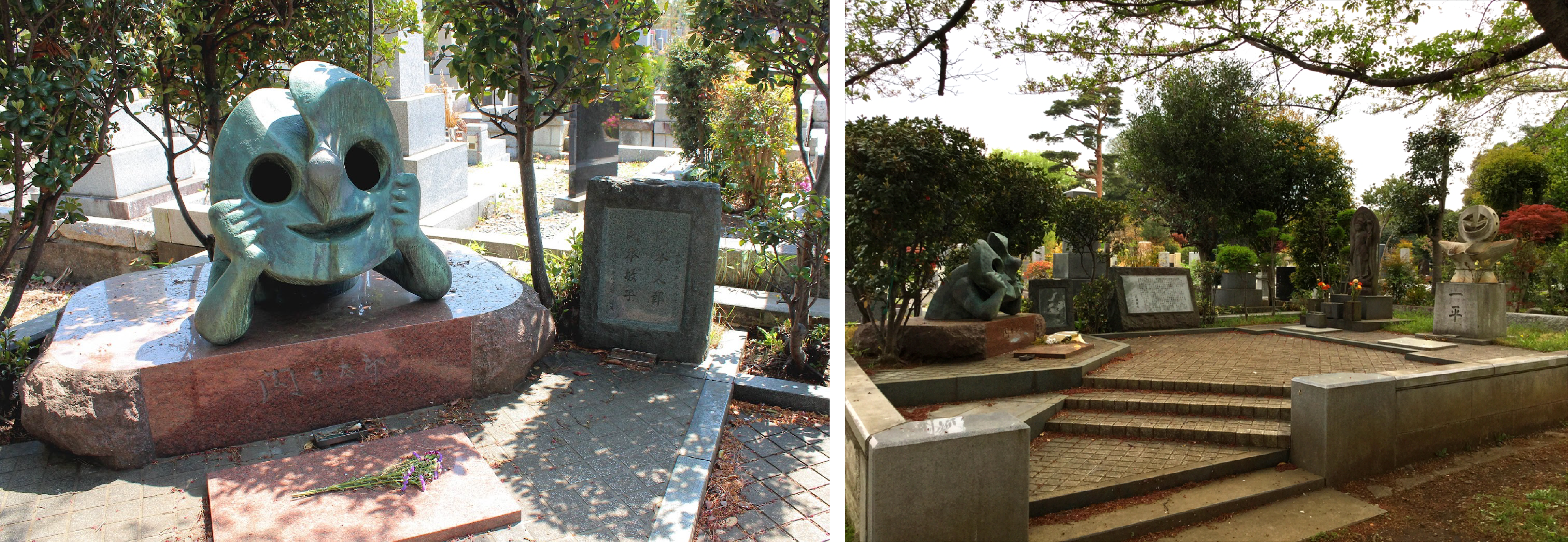 To end off this list of places that you can visit to appreciate Okamoto Tarō's artworks, I thought it would be fitting to include the Okamoto family's grave as the final entry. Okamoto passed away in 1996 at the age of 84, and he was interred in Tama Cemetery together with his parents and lifelong partner, Toshiko. On this grave, there are 2 Okamoto sculptures: "Afternoon" (午後の日 Gogo no Hi), a smiling mask sculpture marking Okamoto's grave, and "Face" (顔 Kao), Okamoto's very first three-dimensional sculpture created, dedicated to his father, Ippei.