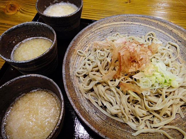 Making my way into the restaurant right before they were taking their last order for the evening, I opted for the oroshi soba zanmai (おろしそば三昧), which was presented as a neatly plated serving of soba with three cups of different dipping broths—with wasabi, which I was already used to, as well as the aforementioned karami daikon and tororo (とろろ grated mountain yam), both of which were new to me. The juice of the karami daikon, though pungent (and a great way to clear blocked noses in winter!), also brought with it a subtle sweetness that the wasabi did not have, and the mixture of broth and juice was refreshing, coupled with the crunch of the grated radish.