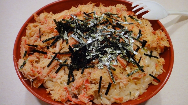 Established in 1902, Banjo Honten has been selling ekiben ever since—while they also offer other ekiben like sabazushi (鯖寿司) and sauce katsudon, it is their Echizen Kanimeshi Ekiben, launched in 1961, that is their star product. While many places either use plain white rice or vinegared rice as the base of their ekiben, Banjo Honten instead cooks the rice with the eggs and innards (カニ味噌 kanimiso) of the snow crabs, further perfuming the rice with the briny scent of the sea, upon which lightly seasoned shredded crab meat is generously piled. The ekiben is sold in a red crab-shaped plastic container and comes with a small pack of shredded seaweed to sprinkle over before eating.