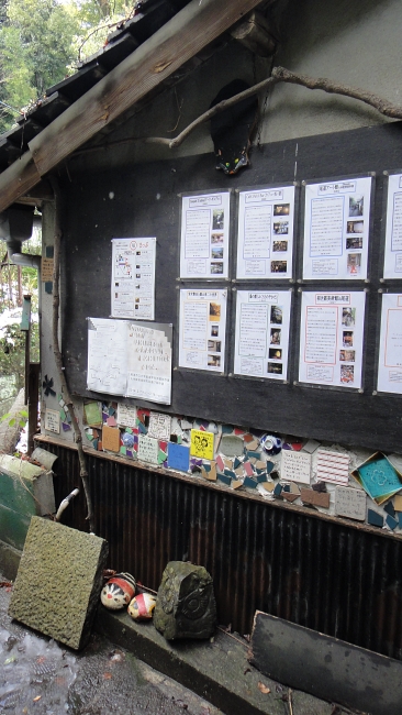 A signboard at the entrance to Neko-no-Hosomichi describing the various shops. Note the two fukuishi-neko below the board! (Image credit: Kevin Koh)