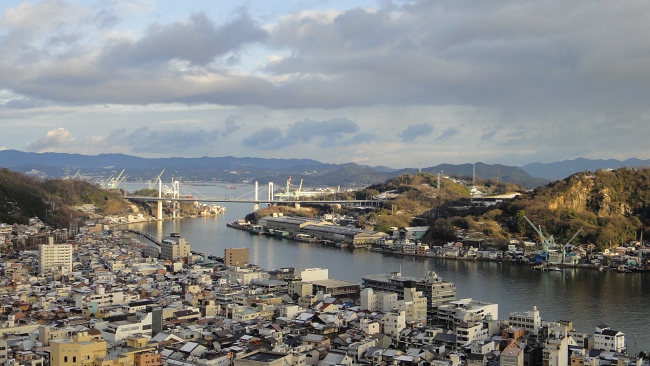 Located between the major cities of Hiroshima (広島市 Hiroshima-shi) and Okayama (岡山市 Okayama-shi), Onomichi still plays a major role in ensuring the movement of goods and people today—it is the start of the Shimanami Expressway (しまなみ海道 Shimanami-kaidō) that links to Imabari (今治市 Imabari-shi) in Ehime (愛媛県 Ehime-ken), connecting the main island of Honshu (本州 Honshū) with Shikoku (四国). Additionally, it forms part of the Chūgoku Transversal Expressway (中国横断自動車道 Chūgoku-oudan-jidō-shadō) that links to Matsue (松江市 Matsue-shi) in Shimane (島根県 Shimane-ken).
