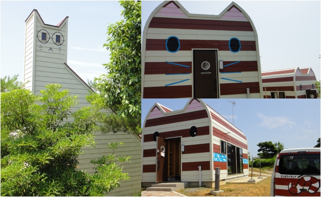 While Tashirojima can be done as a day trip from Ishinomaki, those who wish to stay overnight can either book a room with one of the few minshuku (民宿 guest houses), on the island, or they can choose to stay at Manga Ai-Land (マンガアイランド), a campsite on the island. Its five lodges, easily identifiable from afar due to their distinctive striped patterns, are all painted with cat faces when one gets up close with them. The cat theme is taken one step further when you consider how the lodges are named after the names of cat fur patterns, as well as typical cat names, in Japanese (Shima (しま), Shiro (しろ), Mike (みけ), Dora (どら) and Chibi (ちび))! The lodges have been designed or had their interiors painted by famed manga artists like Chiba Tetsuya (ちばてつや) of “Ashita no Joe” (「あしたのジョー」) fame, as part of Ishinomaki’s project to revitalize the town through manga.