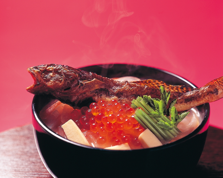 While you can find zōni (雑煮) pretty much anywhere in Japan during the New Year, you can only find this luxurious goby zōni in Miyagi Prefecture (宮城県 Miyagi-ken). Many freeze-dried vegetables and dried gobies are used to make the soup extra flavourful. The soup is then topped with freshly-grilled goby, Sendai’s famous Kamaboko fishcakes, and glistening pearls of salmon roe!