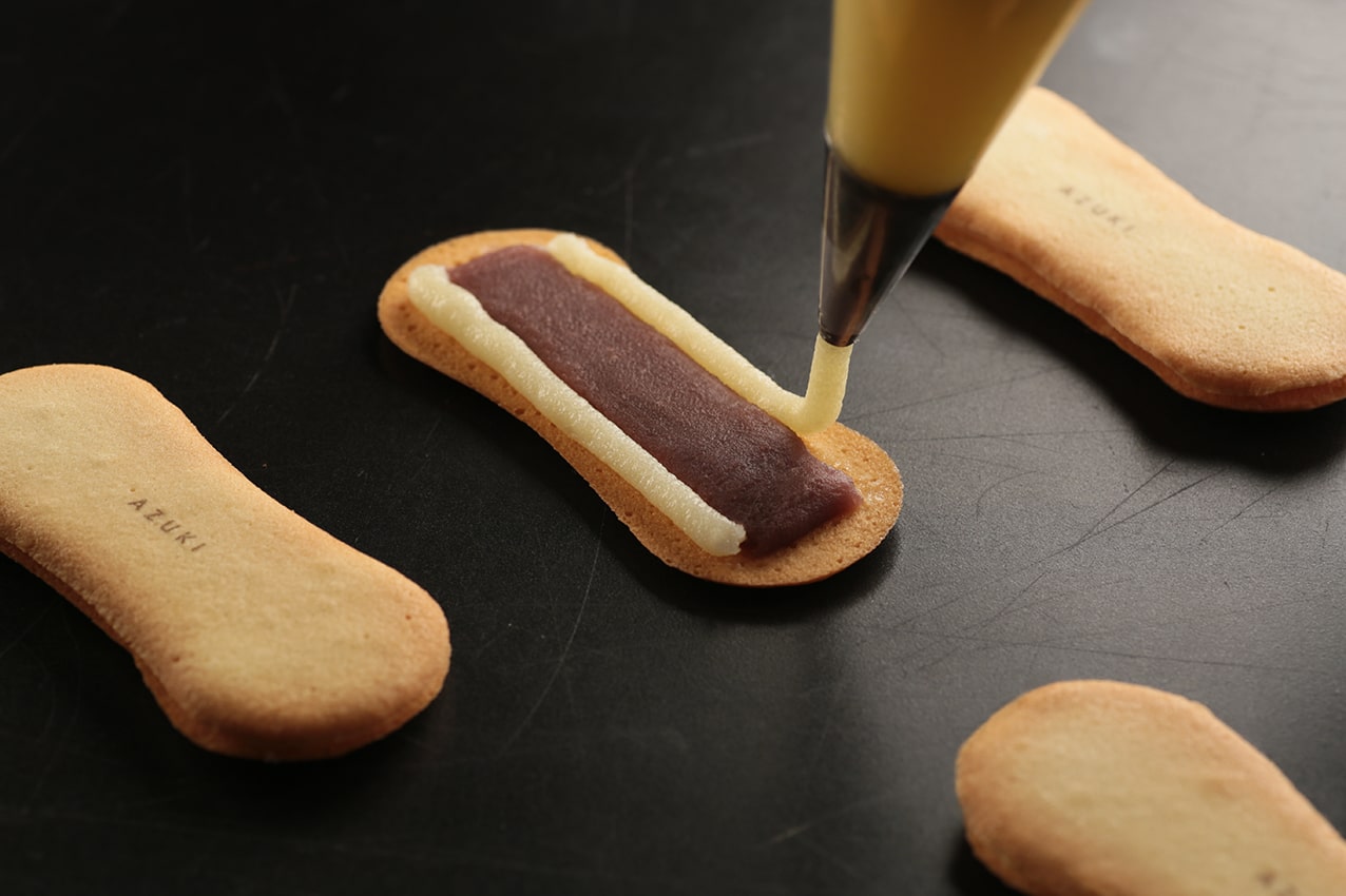 MIYUKA is a new concept launched by Kyoto’s renowned confectionery makers, Bijuu (美十). Born with the concept of fusing the traditional to the modern; the east to the west, MIYUKA’s recommended omiyage is the MIYUKA Fuwa Shari Sando (美結菓ふわシャリサンド) in two flavours: Azuki Butter (生バターとあずき) and Caramel Butter (生バターとキャラメル). Unlike most crispy langue de chat cookies, this particular one has a distinctively moist texture with a generous layer of east-meets-west filling—homemade azuki paste with raw butter, or fragrant caramel with raw butter.