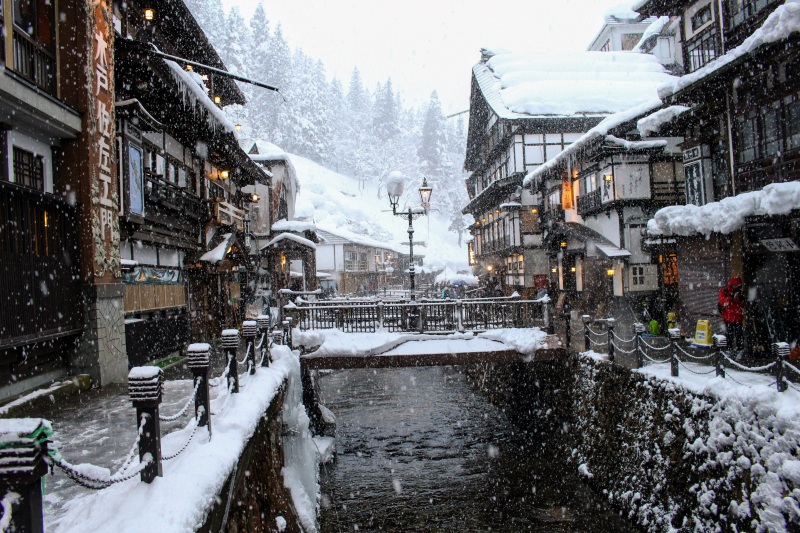 The picturesque Ginzan Onsen (銀山温泉) town in Yamagata Prefecture's (山形市 Yamagata-shi) Obanazawa City (尾花沢市 Obanazawa-shi) is like stepping back in time to the early 20th century. Known for its Taisho Period (1912–1926) architecture and quaint atmosphere (the streets are lit by gas lamps) Ginzan Onsen is a truly magnificent location perfect for relaxing and enjoying the tranquillity of Northern Japan. The town plays host to three public hot springs and a number of footbaths and, like many other onsen towns in this region of Japan, the water is renowned for its therapeutic effects. Especially stunning in winter, the town is also delightful in other months where visitors are able to go hiking and trekking and enjoy the majestic waterfalls which are found in the region.