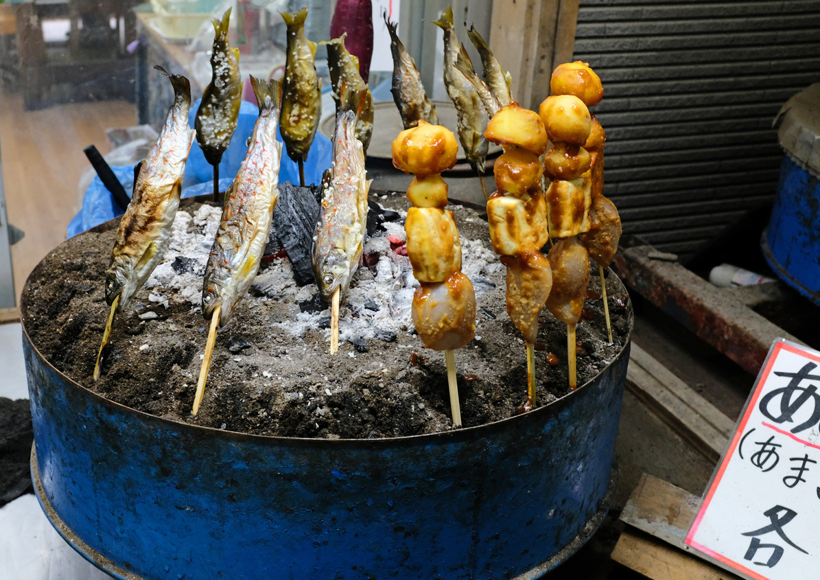 Local river fish of ayu and amego, and skewers of dekomawashi. (Image credit: Hui Min)