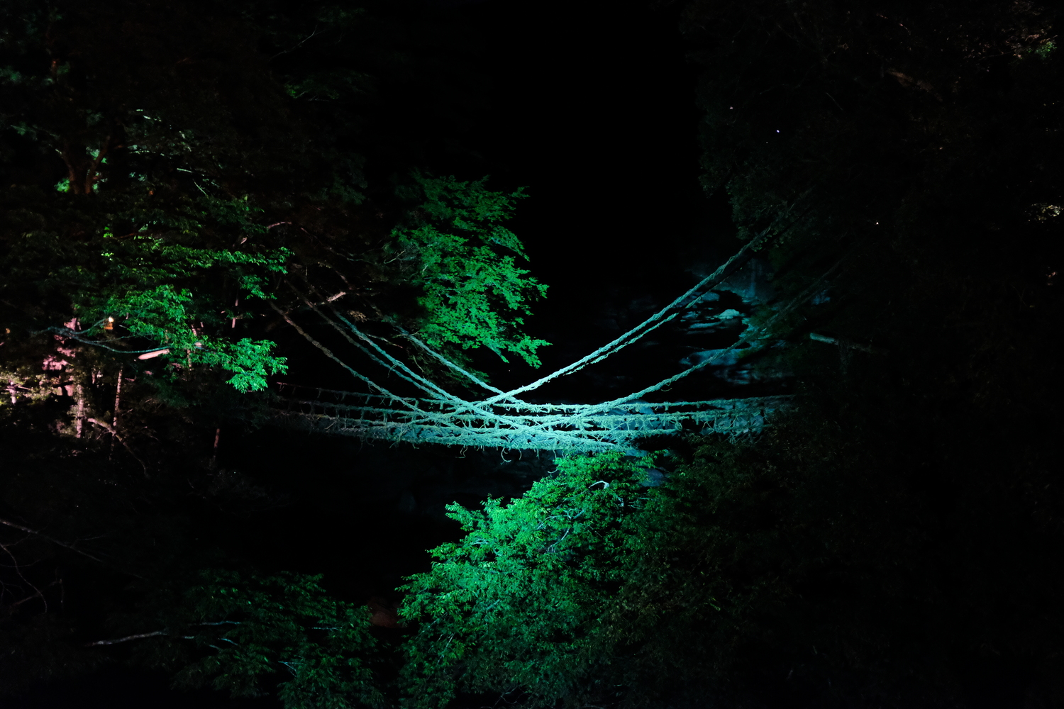 After a rejuvenating soak and kaiseki dinner, it is not yet time to turn in for the night. We board the hotel’s cute “bonnet bus” for a night tour of Kazurabashi Bridge. Of course, crossing is not allowed, but the illuminations do elevate the air of mystery.