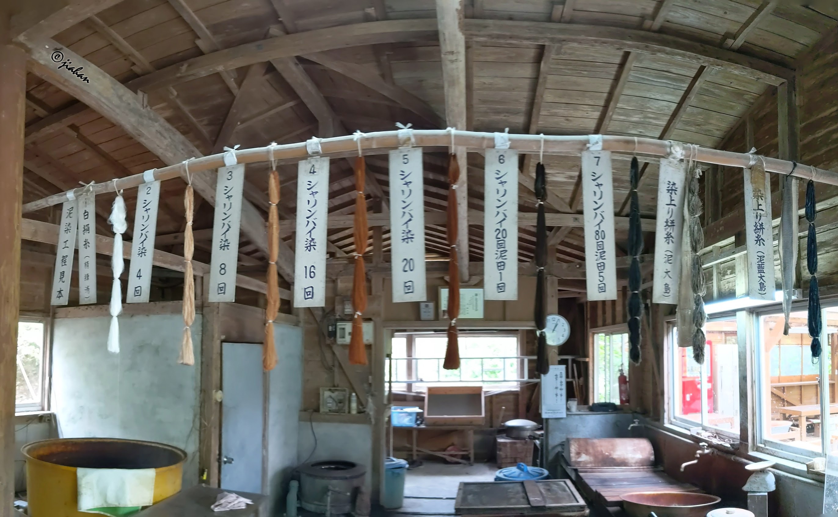 The pure white silk on the left is pre-dyeing. The silk is then dyed with Japanese hawthorn シャリンバイ sharinbai), and the brown deepens after 4, 8, 16, 20 repetitions. The silk is then put through mud-dyeing as well, and the glossy black colour is the last of the range of colours available. With the introduction of modern artificial colouring, the range of colours has increased greatly, while the amount of labour required has fallen. However, some craftspeople are still keeping the traditional art alive, and the earthy colours of traditional Amami tsumugi still hold a special prestige.