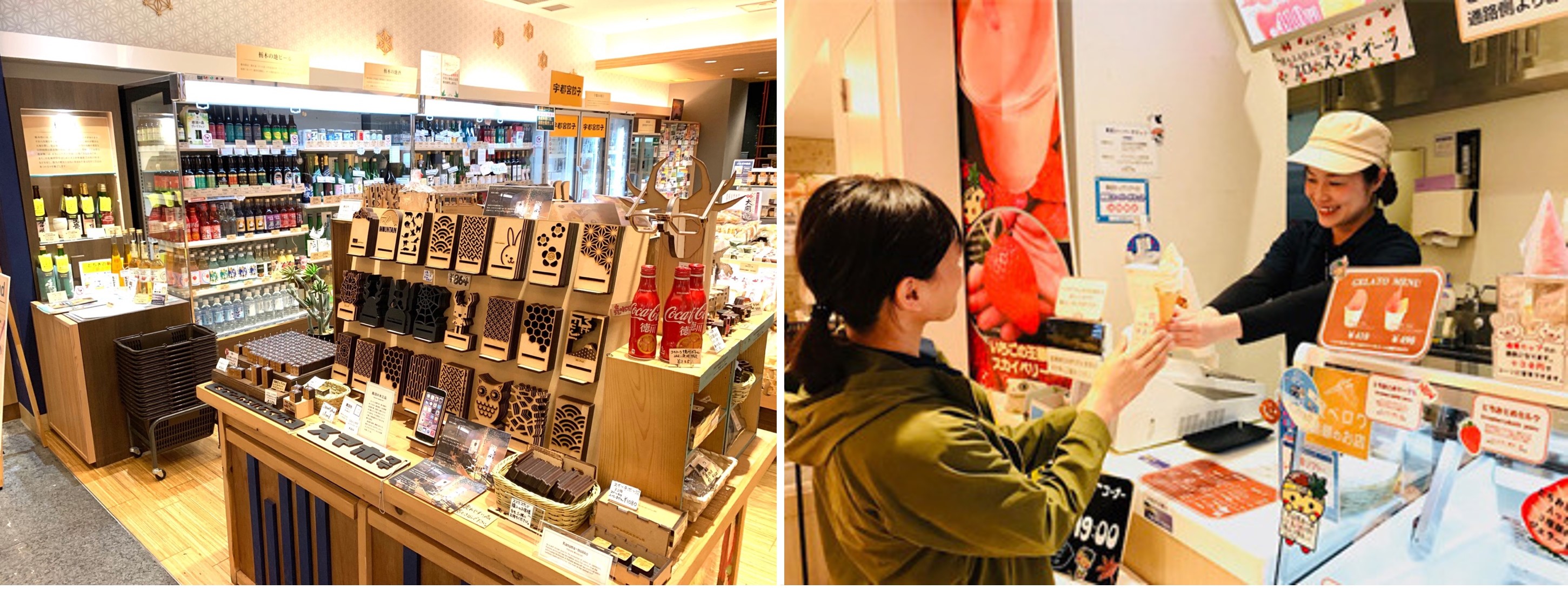Traditional handicrafts (left) and soft-serve ice cream (right) in the Tochimaru Shop. (Image credit: とちまるショップ)