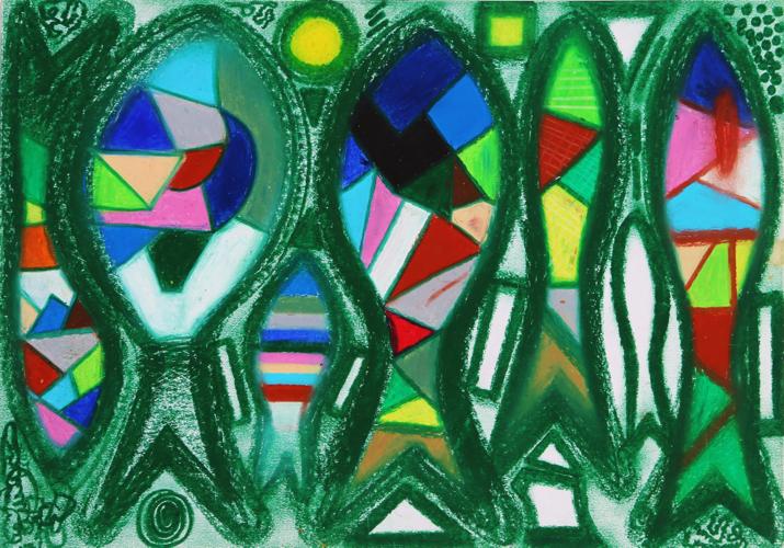 Take for example, Mitsui Keigo’s piece titled: Sakana (さかな). The abstract shapes clearly used to represent fish scales but each one a different colour, reminding the viewer of the rainbow-like shimmer of light reflecting off fresh fish. The right-most fish has a clearly visible wound which stands out clearly because it is the only mark on the page that cuts across the scales, which makes you wonder if it was put there purposefully with some sort of meaning.