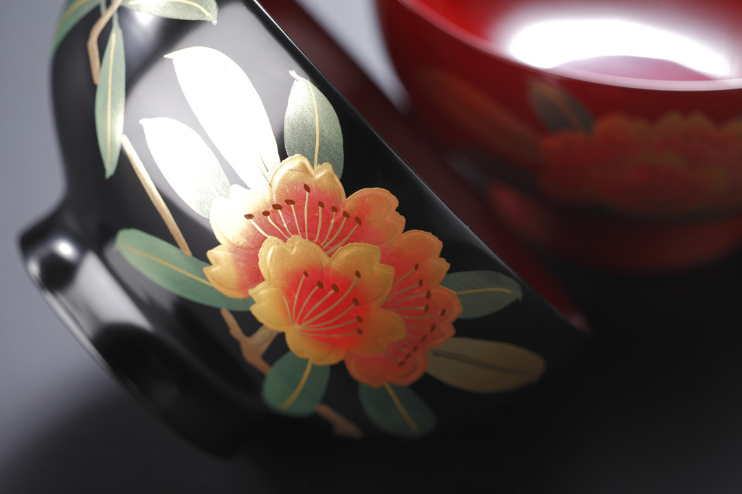 The allure of lacquer lies in how its deep colours exude a glossiness—as it ages, it hardens and becomes clearer, its shininess increasing as time goes by. It is because of this that the beauty of lacquerware is apparent not immediately after application, but after it has been used for a few years. It is also very durable, being capable of resisting strong alkalis and acids such as royal water, or nitrohydrochloric acid, capable of dissolving gold, and hydrogen fluoride, which corrodes ceramics and glass. These properties of lacquer explain why centuries-old lacquerware displayed in museums still maintain their beauty even after all this while.