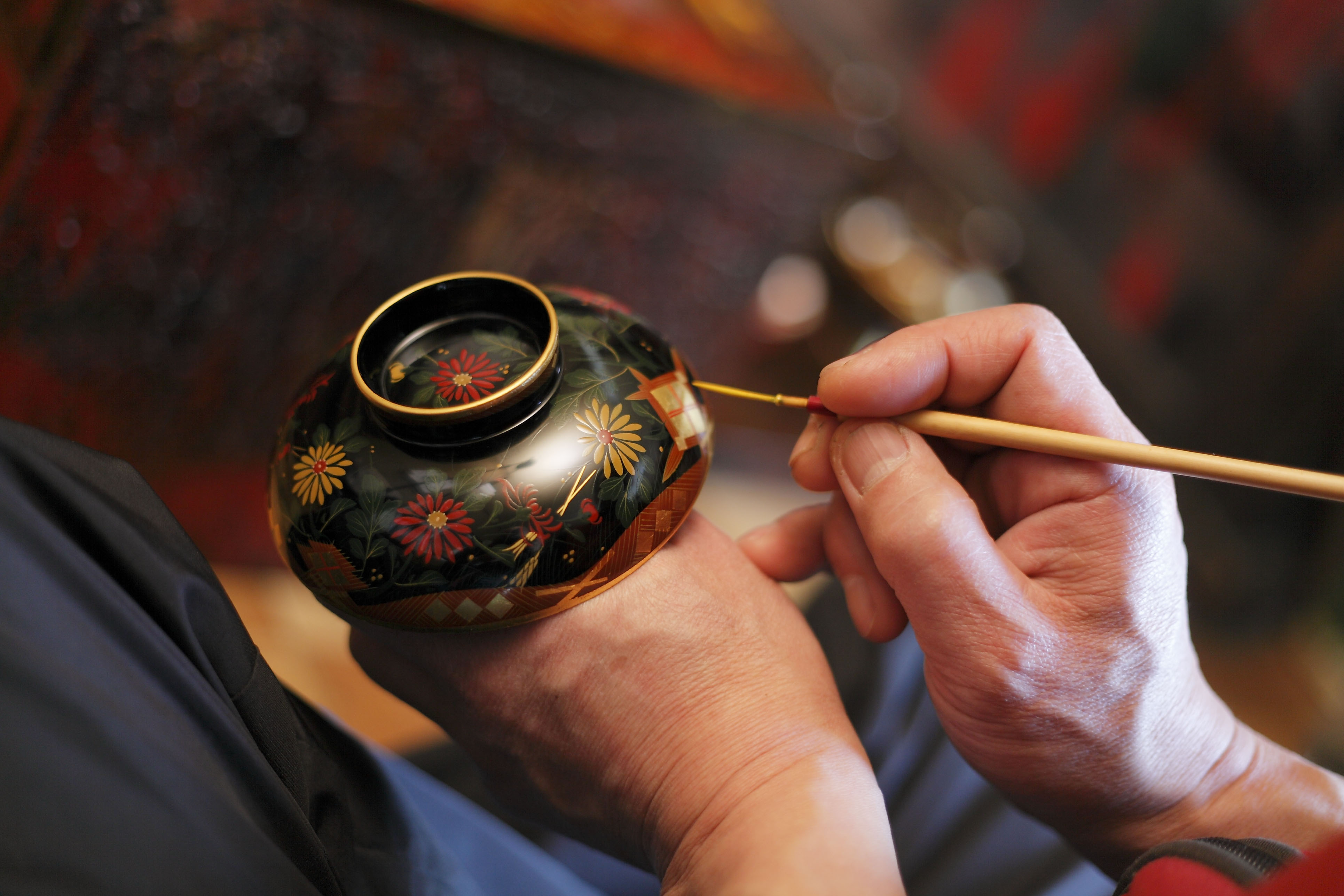 Lacquerware being painted with an intricate design. (Image credit: urushikaoru)